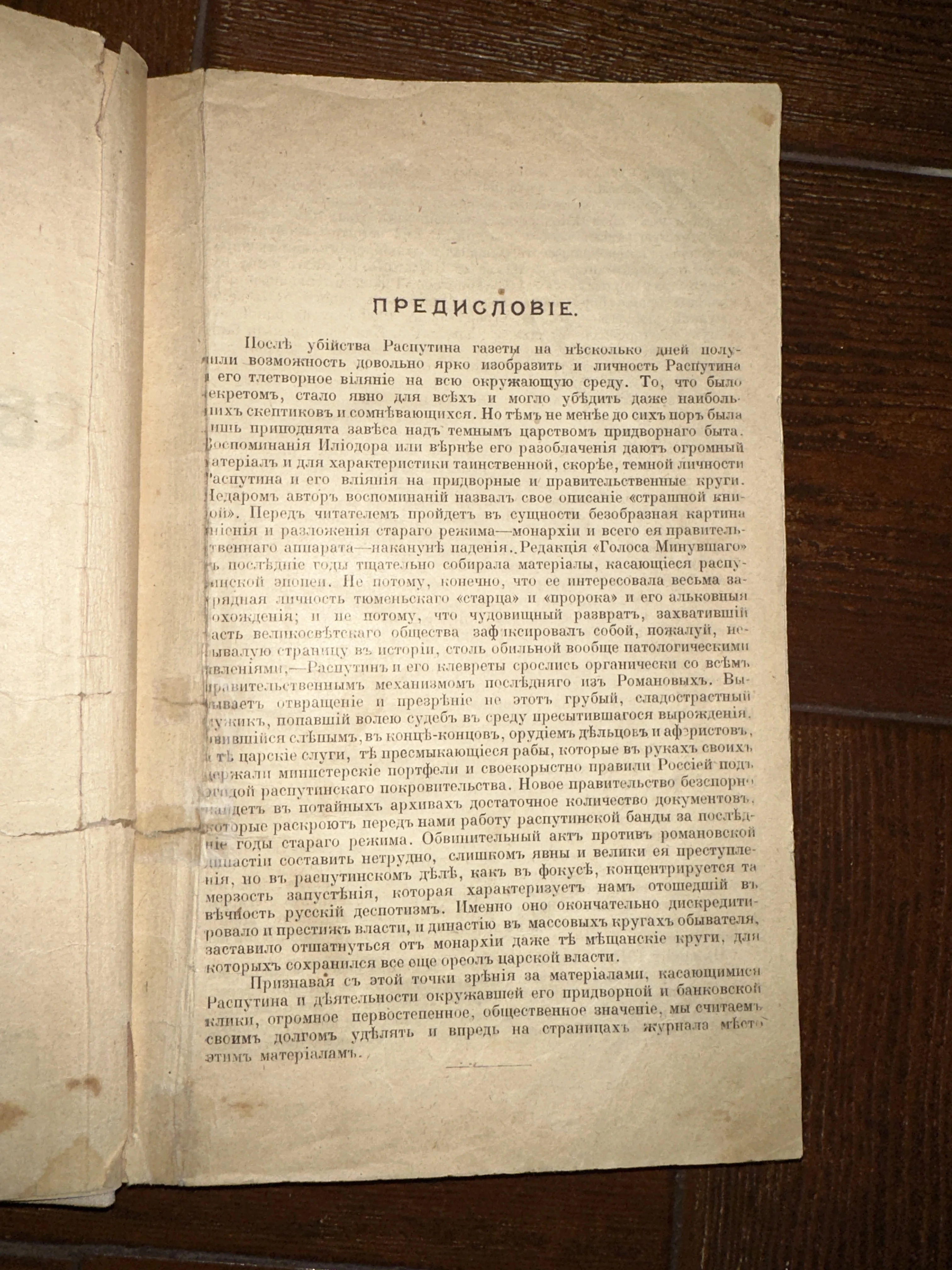 Этот подлинный фрагмент дореволюционной печати погружает в атмосферу интриг и тайн заката Российской империи. Текст, набранный старой орфографией, повествует о скандальной фигуре Григория Распутина и материалах журнала «Голос Минувшего». Благородная патина времени на бумаге подчеркивает историческую ценность этого документа эпохи.