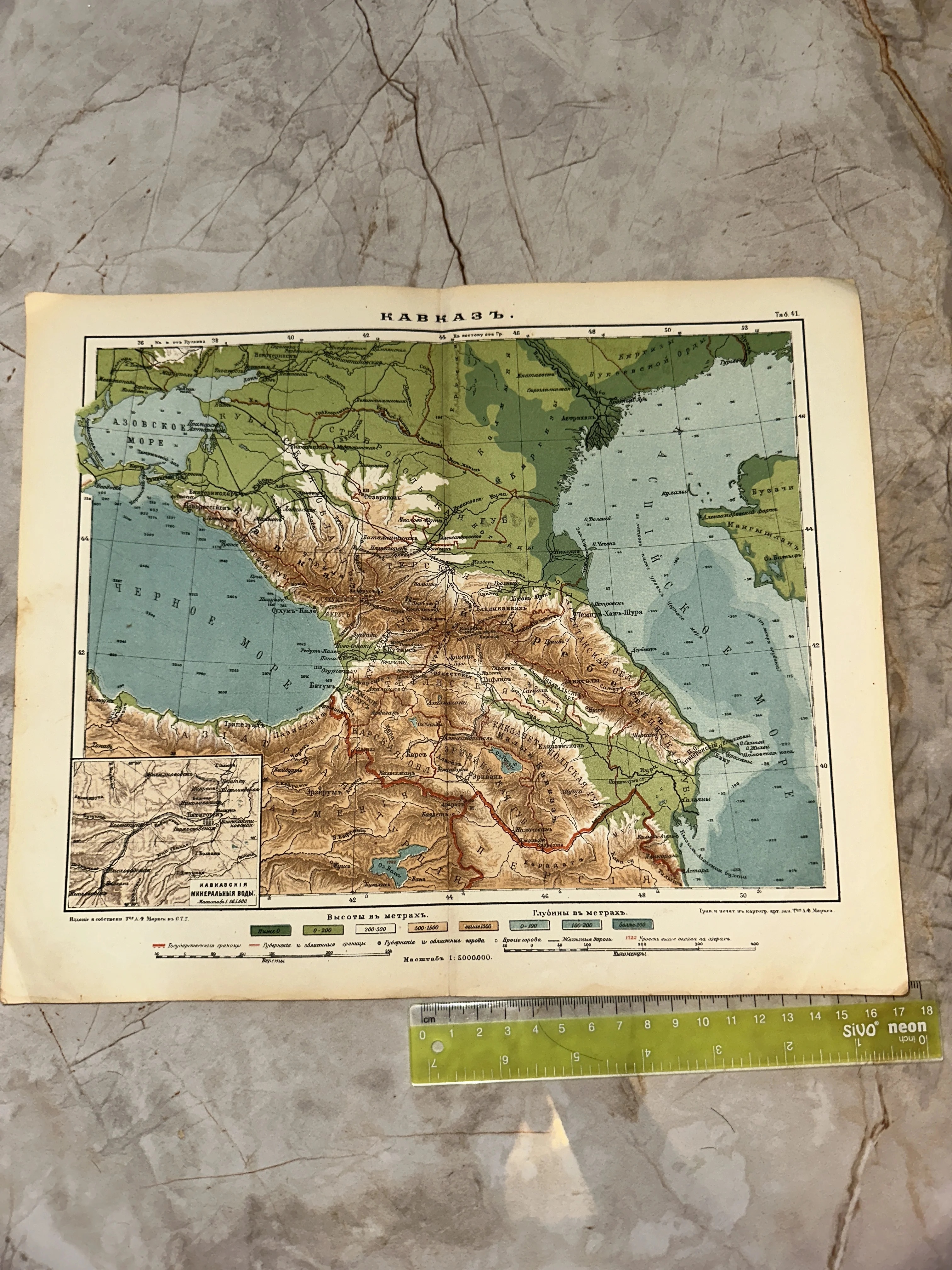 Редкий образец дореволюционной картографии, детально отображающий ландшафт Кавказского перешейка от Черного до Каспийского моря. Карта отличается великолепной прорисовкой рельефа, наличием шкалы высот и отдельной врезки с Кавказскими Минеральными Водами. Прекрасная сохранность бумаги и насыщенность красок делают этот экземпляр ценным приобретением для коллекционера или изысканным украшением интерьера.