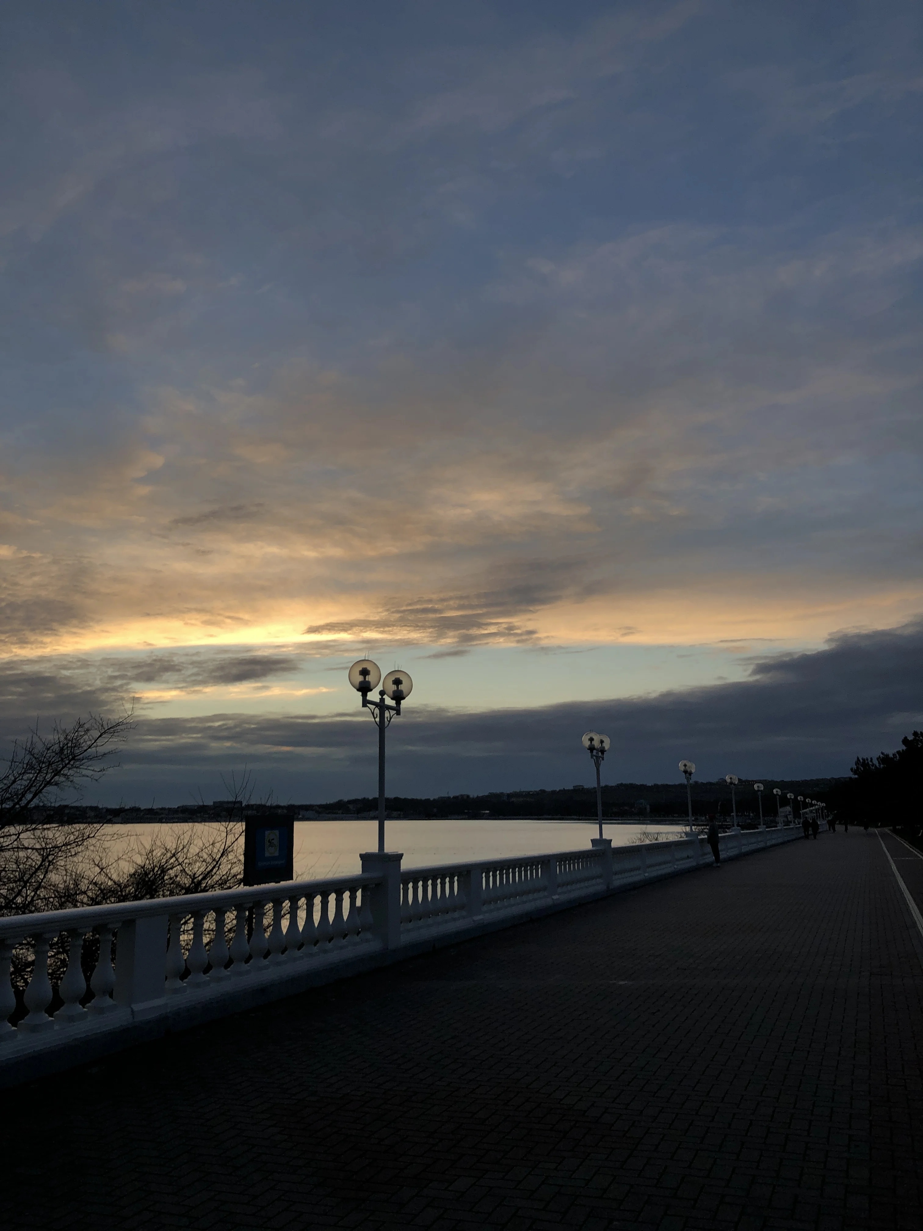 Живописный кадр, запечатлевший переход дня в вечер на элегантной набережной. Классическая балюстрада и силуэты шарообразных фонарей на фоне драматичного неба создают атмосферу ностальгии и спокойствия, идеально подходящую для коллекции городских пейзажей.