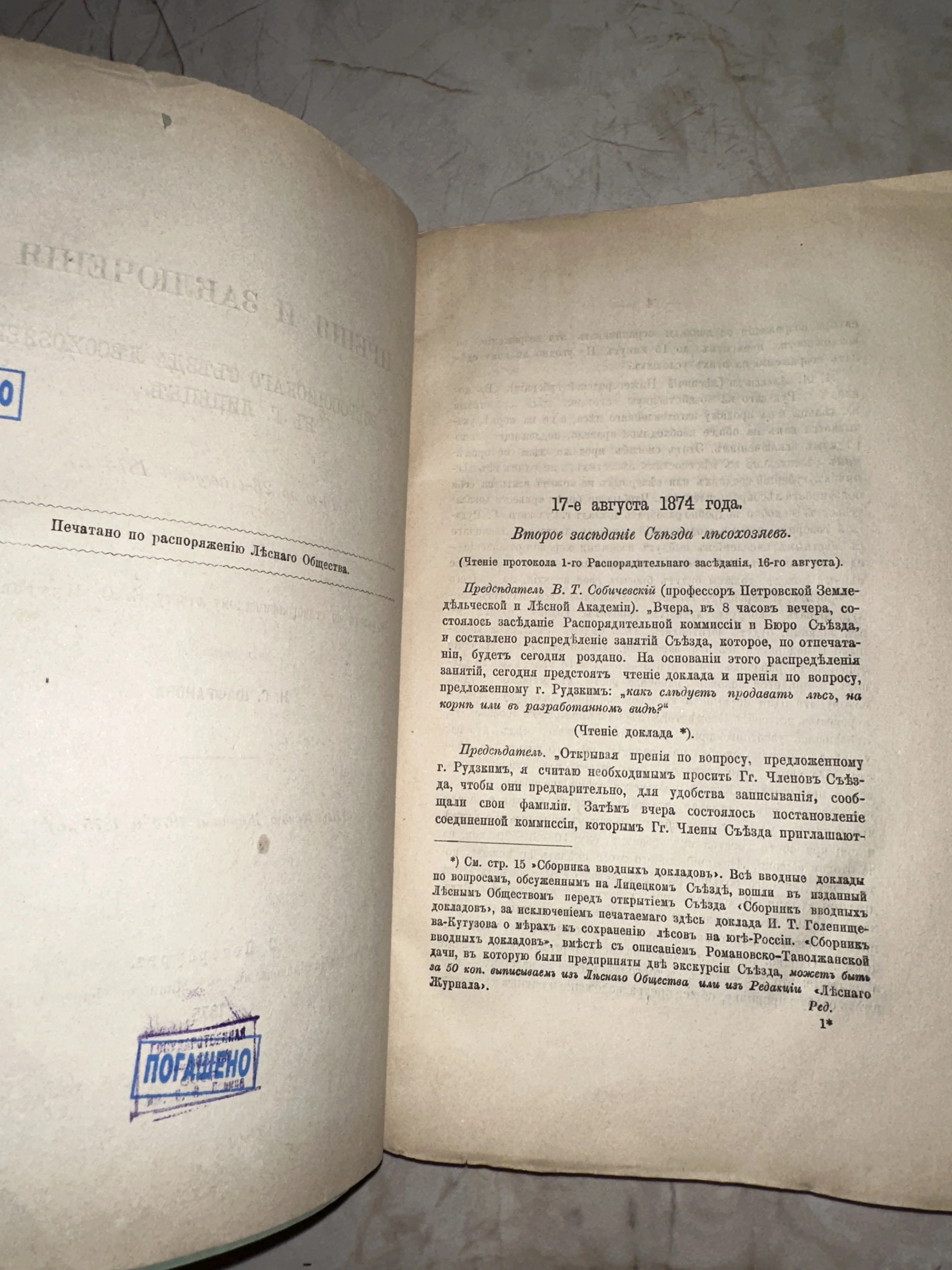 Уникальное свидетельство развития лесного дела в Российской империи, напечатанное по распоряжению Лесного Общества. Желтоватая бумага с благородной патиной времени и оригинальный синий штамп «Погашено» придают изданию особую архивную ценность. Текст выполнен в дореволюционной орфографии, сохраняя аутентичную атмосферу научной мысли XIX века.