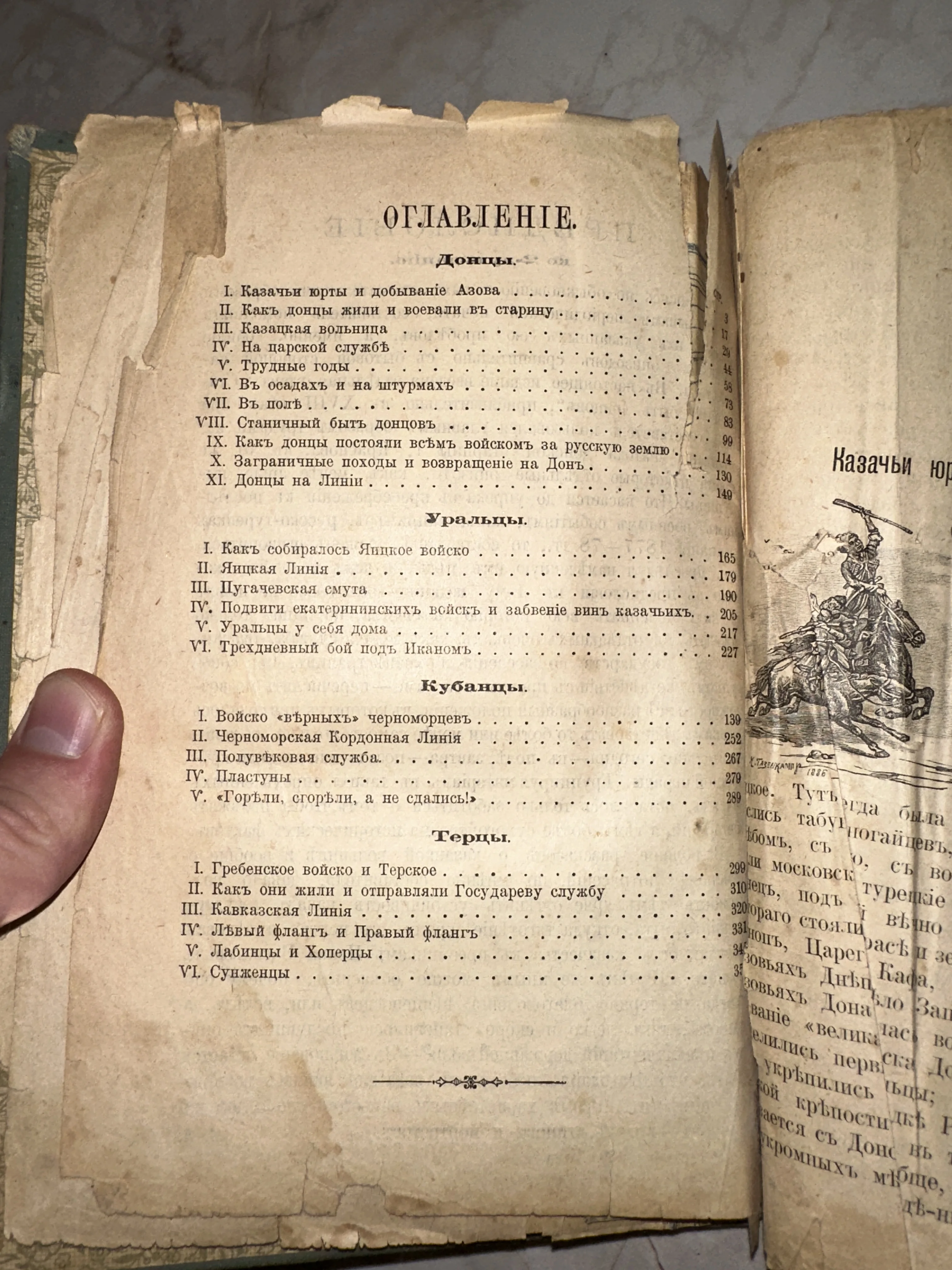Разворот старинной книги с оглавлением на русском языке, перечисляющим главы о донских, уральских и кубанских казаках. Видна пожелтевшая бумага и иллюстрация казака.