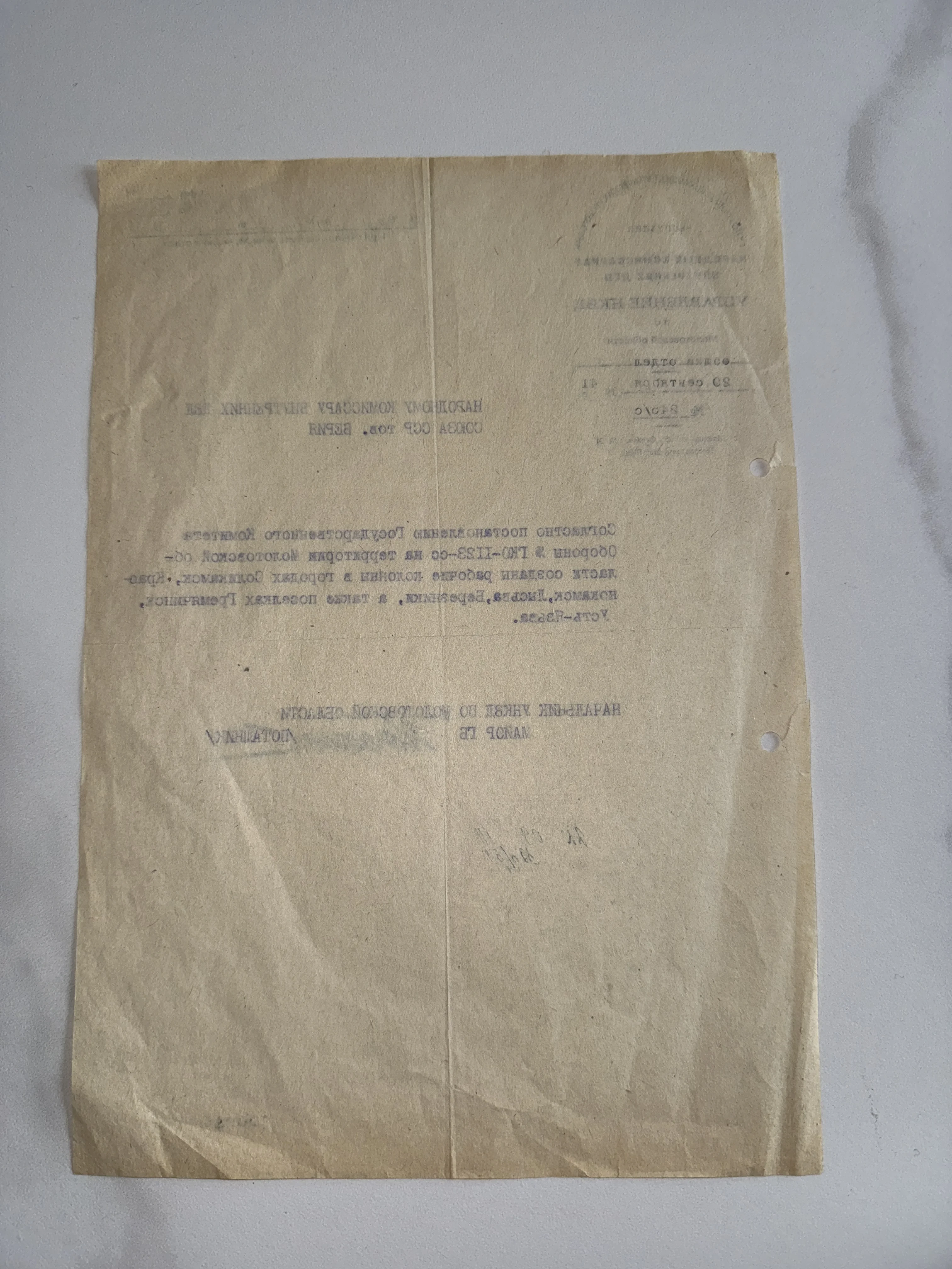 Аутентичный образец канцелярской документации середины XX века на характерной папиросной бумаге. Сквозь полотно листа проглядывают оттиски печатей и машинописный текст Народного комиссариата, передающие дух ушедшей эпохи. Предмет находится в хорошей сохранности и представляет интерес для исследователей истории и коллекционеров советской старины.