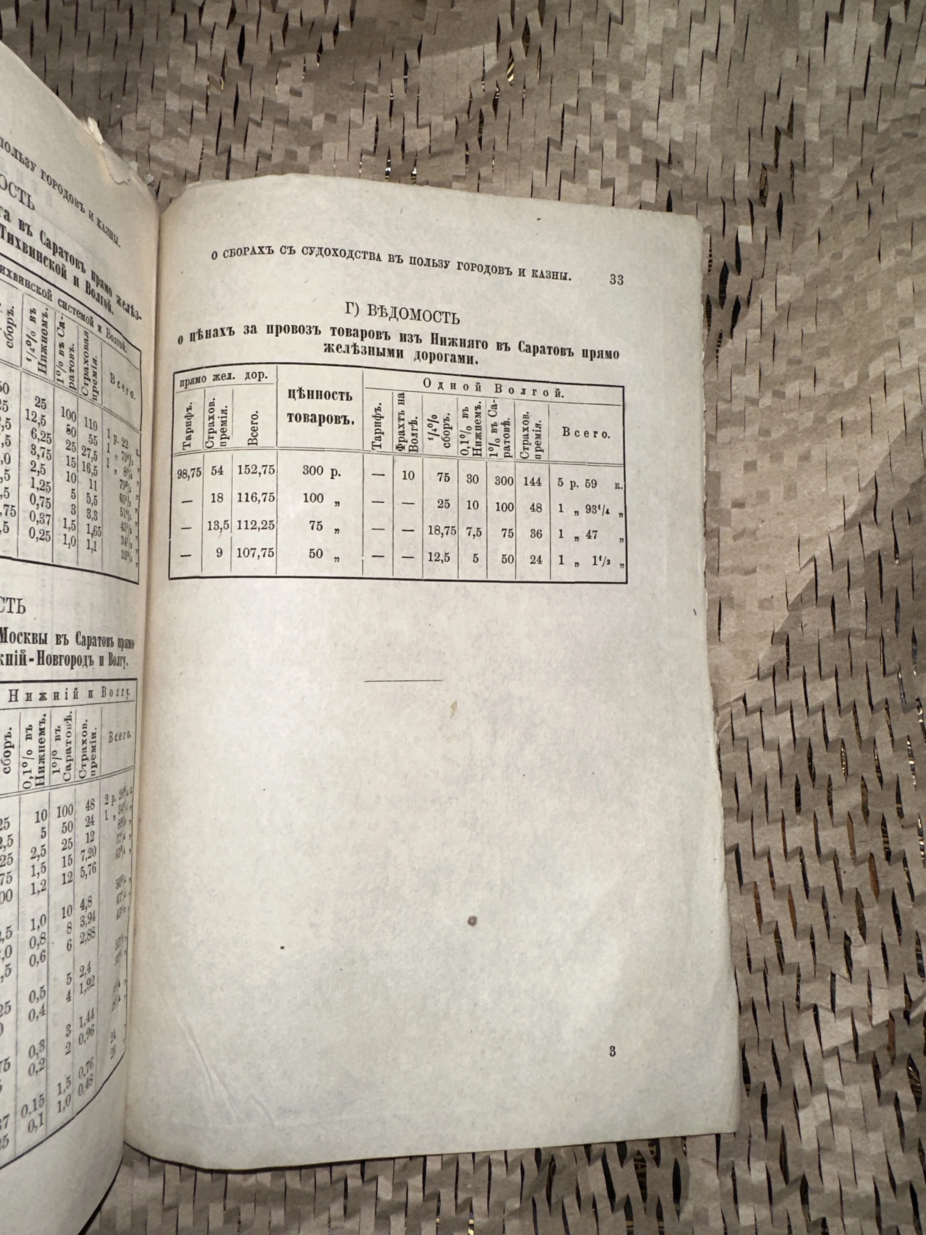 Старинная ведомость тарифов на перевозку грузов по Волге и железной дороге