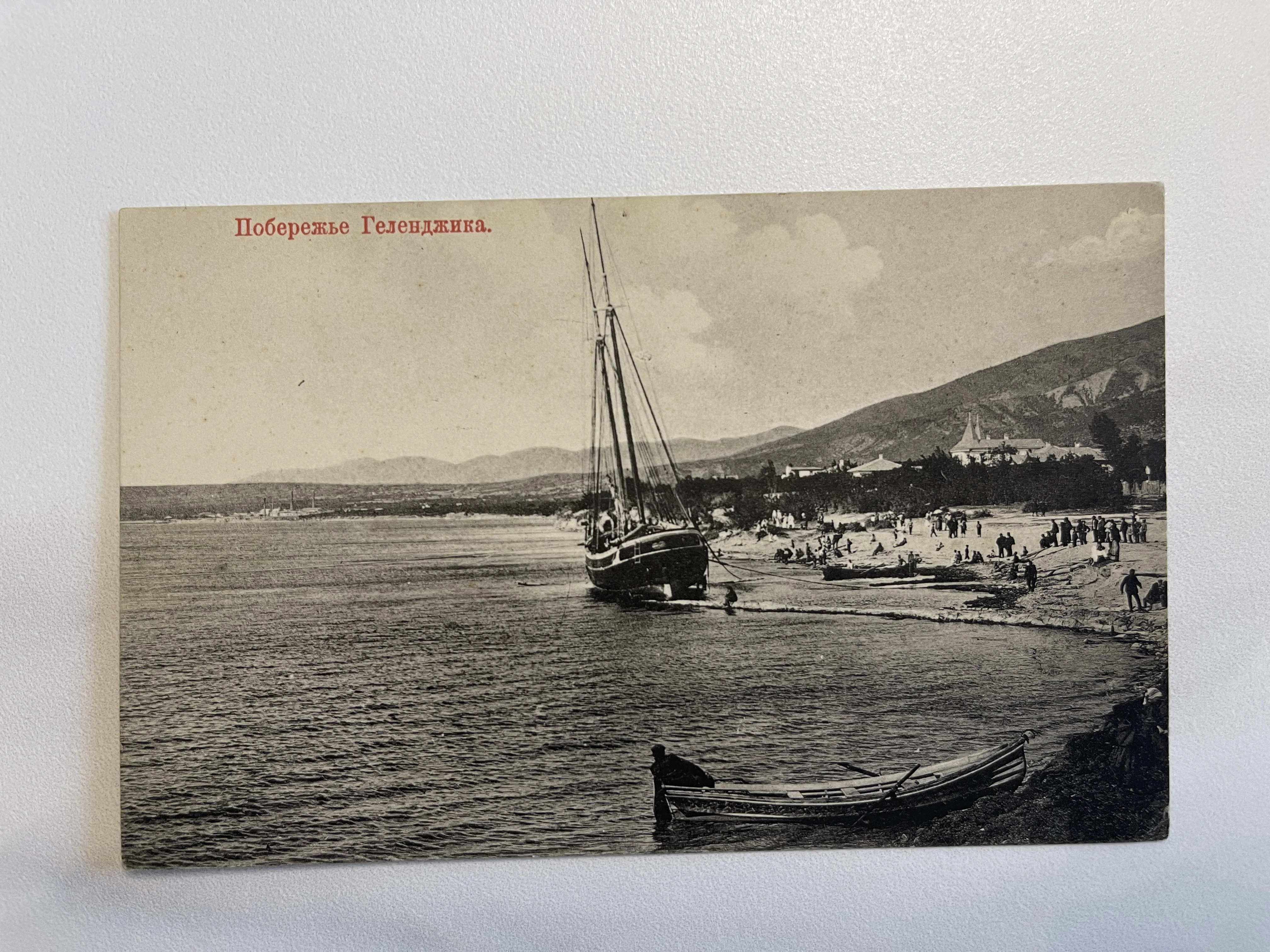 Эта редкая дореволюционная открытка начала XX века запечатлела безмятежную атмосферу старого Геленджика с его величественными парусниками и первыми отдыхающими. Детализированное изображение передает дух ушедшей эпохи, позволяя рассмотреть особенности прибрежного ландшафта и быта того времени. Ценный экземпляр для коллекционеров видов черноморского побережья и любителей истории русского юга.