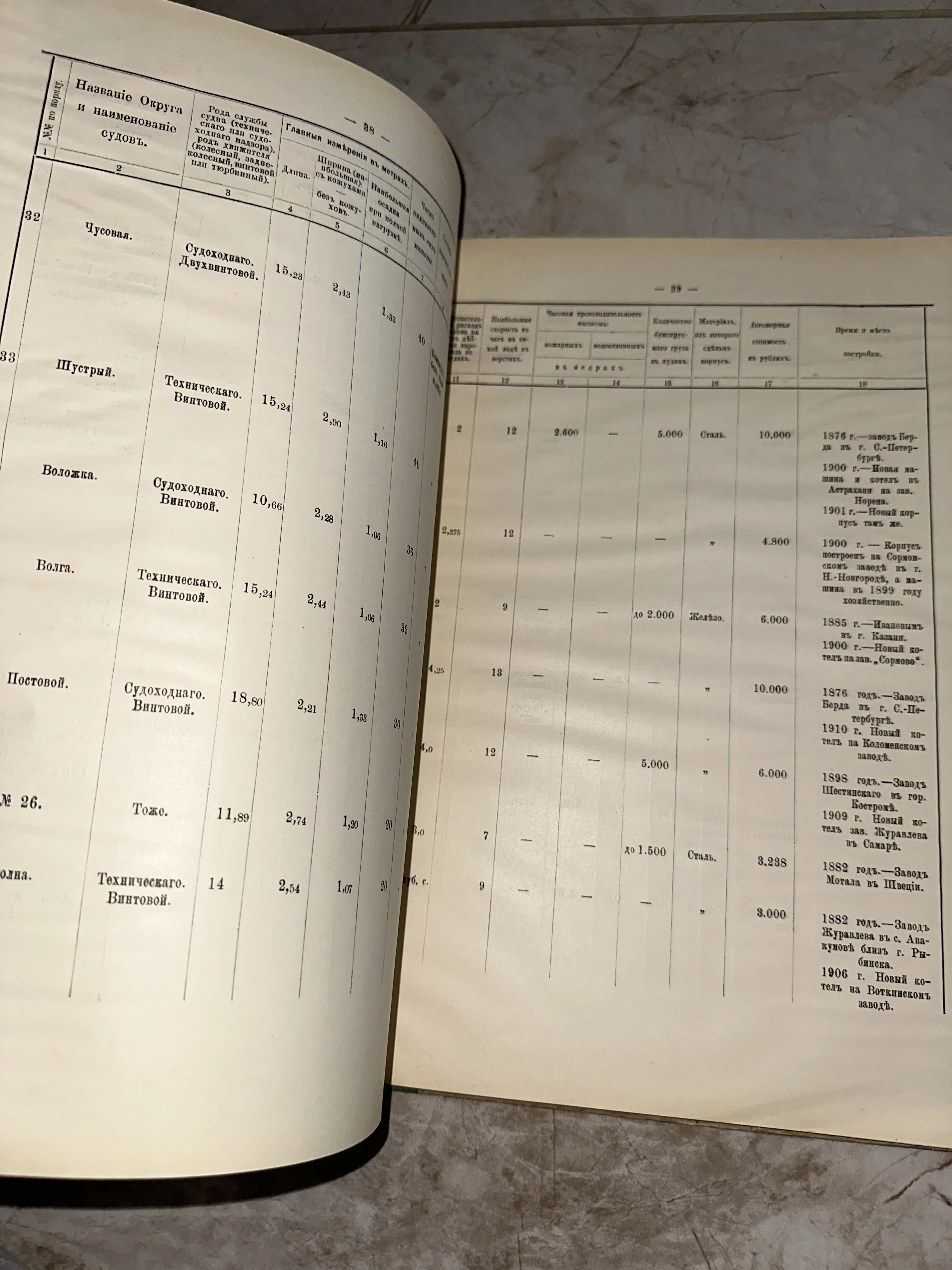 Перед вами уникальный документ эпохи — страницы справочника с подробным перечнем судов, бороздивших реки и моря Российской Империи. На пожелтевшей бумаге сохранились данные о постройках на заводах Берда и Сормово, запечатлевшие историю отечественного судостроения конца XIX — начала XX веков. Четкая типографская печать и аутентичная орфография передают строгую атмосферу инженерной мысли прошлого.