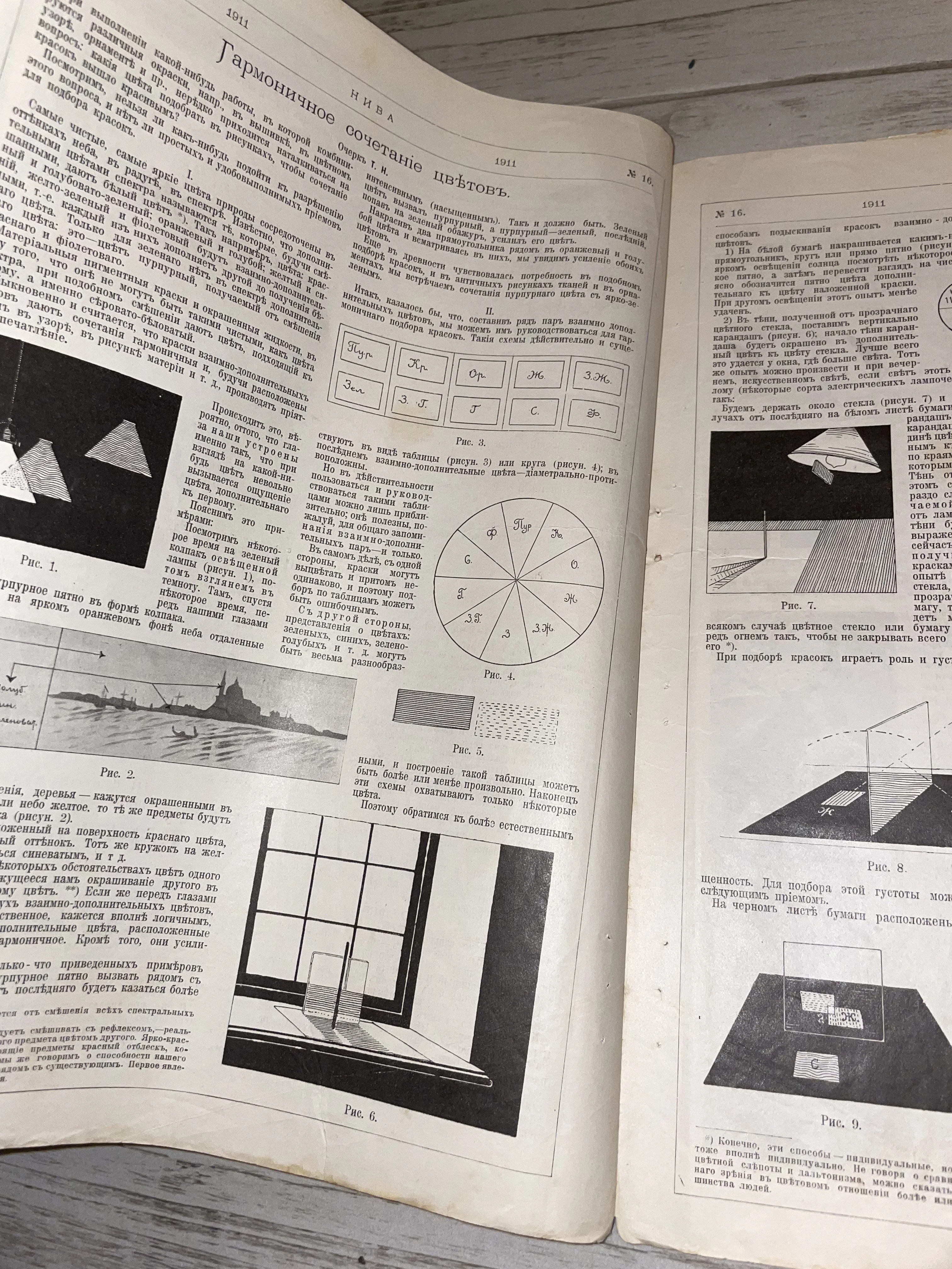 Перед вами подлинный фрагмент истории дореволюционной печати — разворот знаменитого журнала «Нива» с научно-популярной статьей о теории цвета. Страницы с характерной патиной времени и детально прорисованными схемами цветовых сочетаний передают атмосферу просвещения начала XX века. Этот экземпляр станет ценным пополнением коллекции старинной периодики или уникальным элементом декора для любителей типографики и дизайна.
