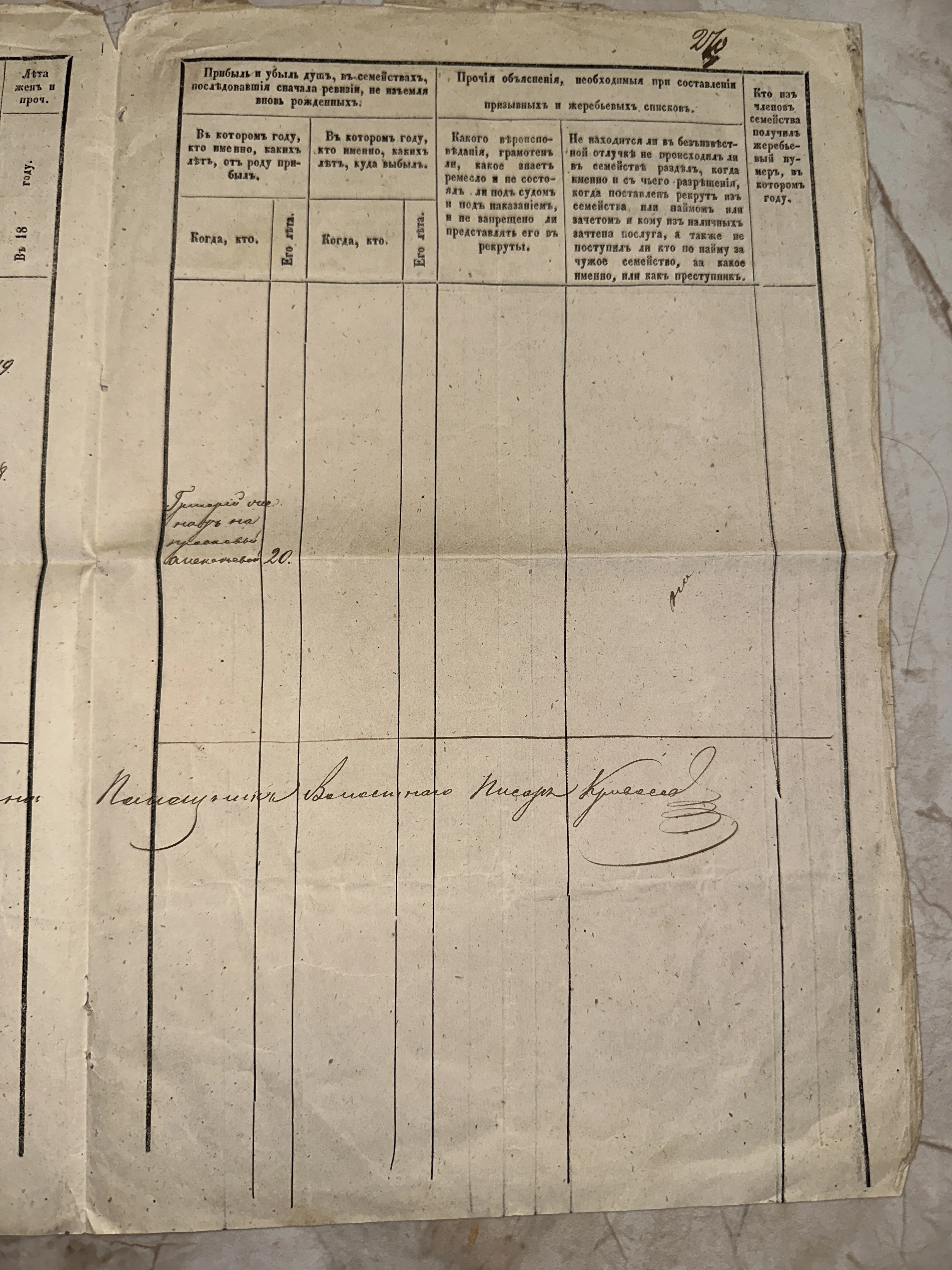 Уникальный образец дореволюционного документооборота, представляющий собой лист учета населения с графами о «прибыли и убыли душ». Пожелтевшая от времени бумага, четкие линии таблиц и изящная каллиграфия волостного писаря создают неповторимую атмосферу уездной канцелярии XIX века. Редкий артефакт для коллекционеров генеалогии и любителей истории Российской империи.