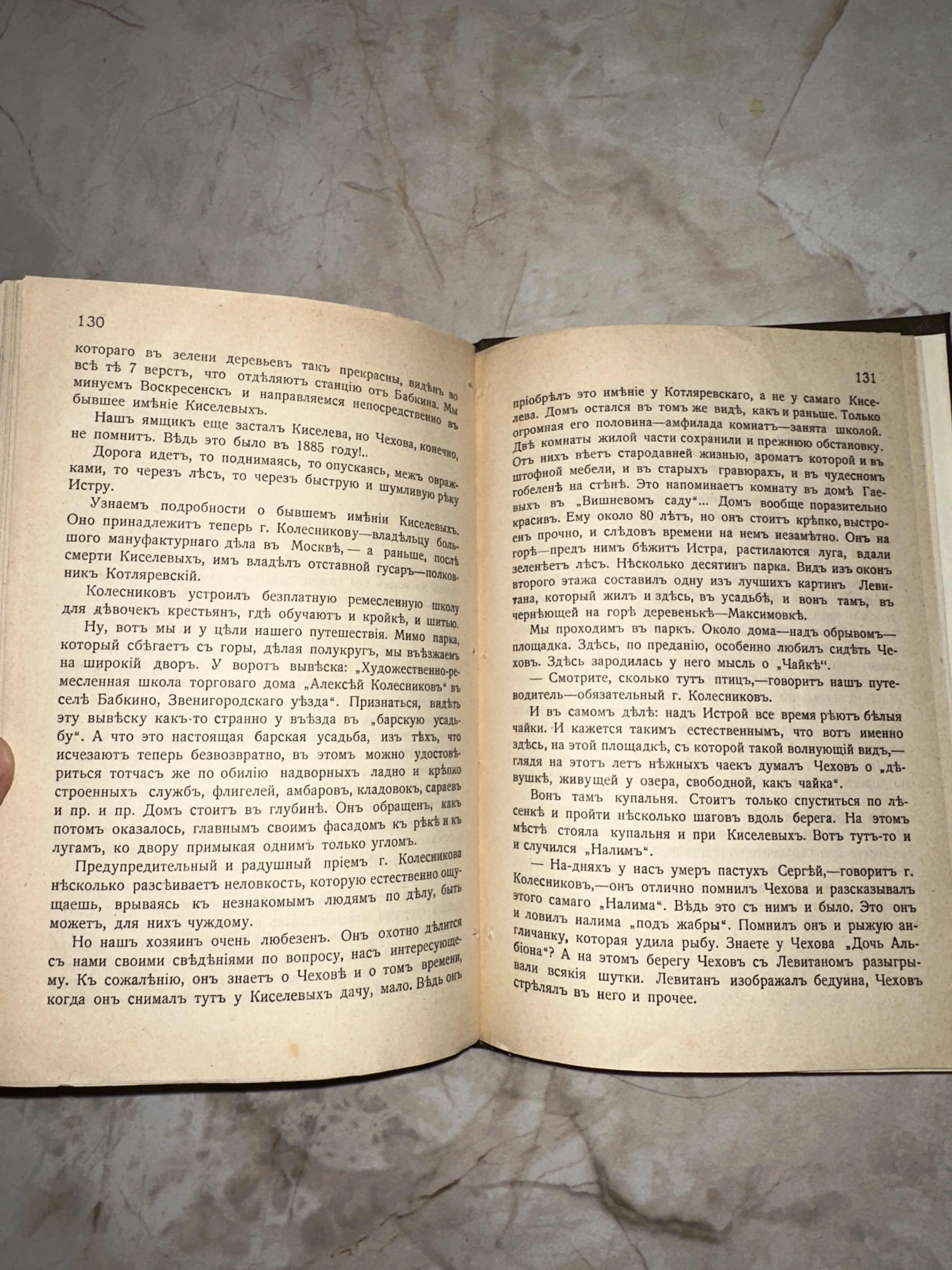 Разворот старинной книги на страницах 130-131 с текстом в дореволюционной орфографии о жизни Чехова и Левитана.