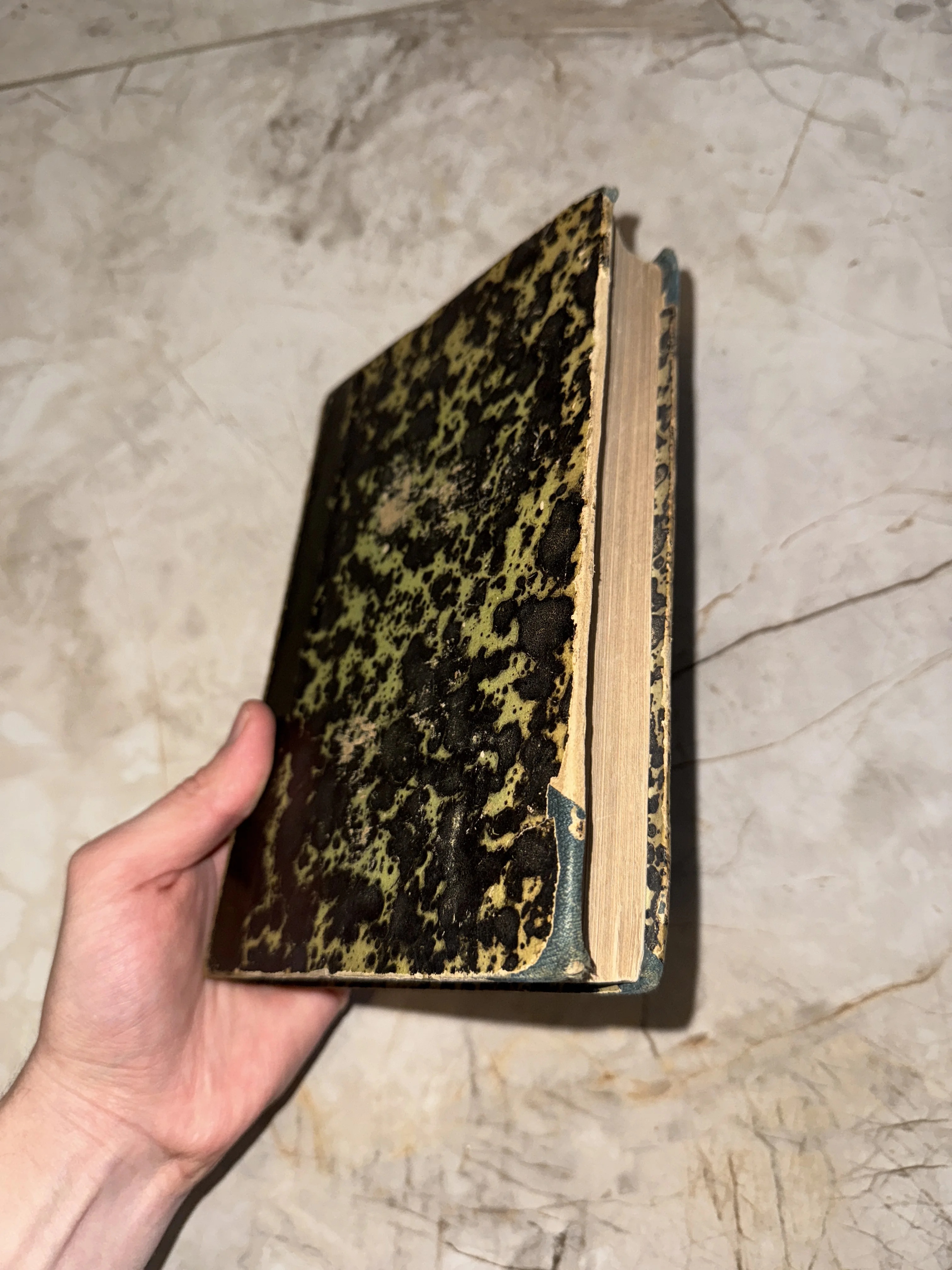 Старинная книга с характерным пятнистым мраморным узором на обложке, которую держат в руке на фоне мраморного пола.