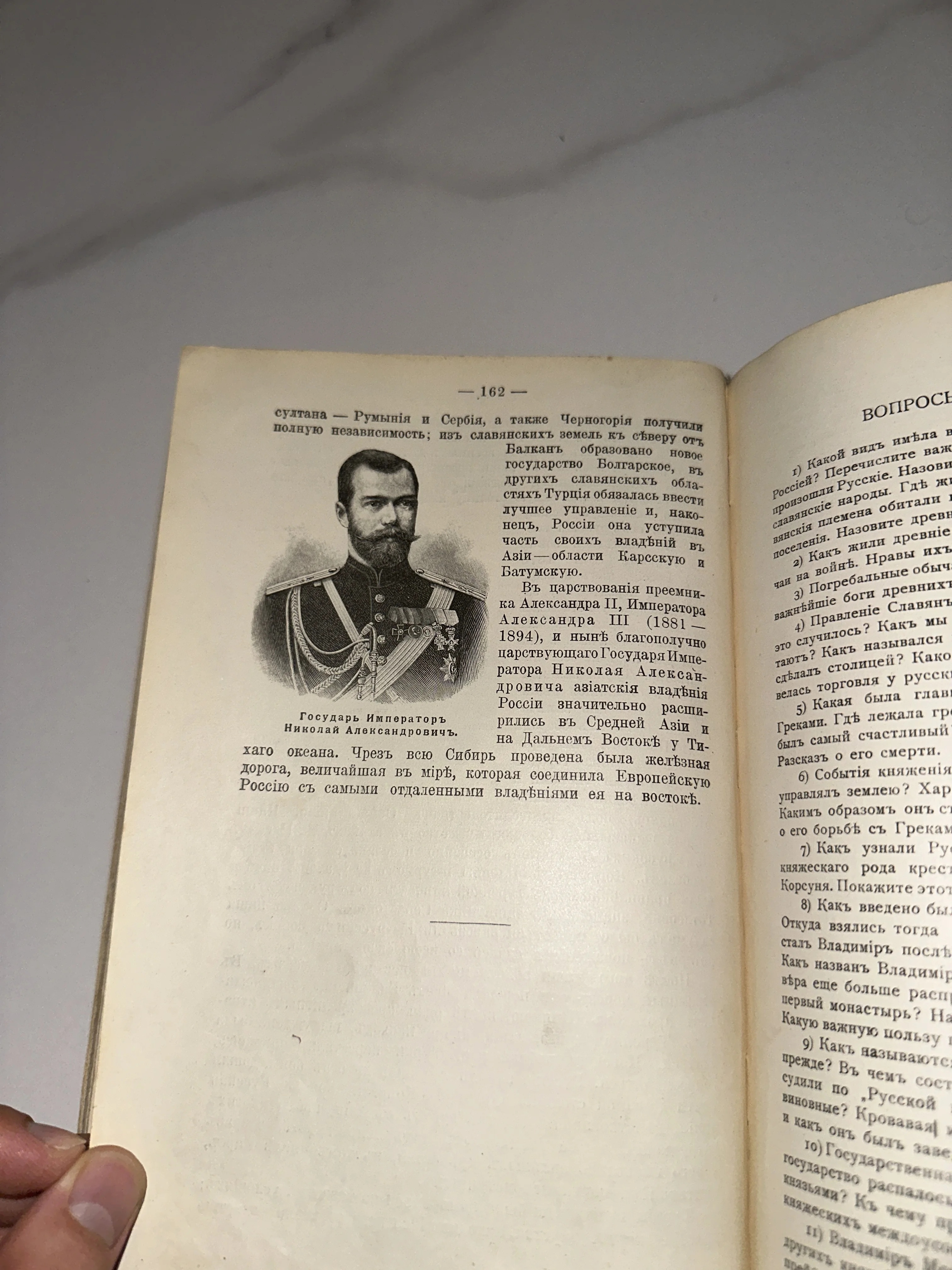 Этот редкий книжный разворот переносит читателя в эпоху последних лет Российской империи, представляя великолепно сохранившийся портрет Николая II в парадном мундире. Текст, напечатанный в дореволюционной орфографии, повествует о расширении восточных границ государства и строительстве Великой Сибирской дороги. Пожелтевшая бумага и четкая типографская печать подчеркивают подлинность и историческую ценность данного коллекционного экземпляра.
