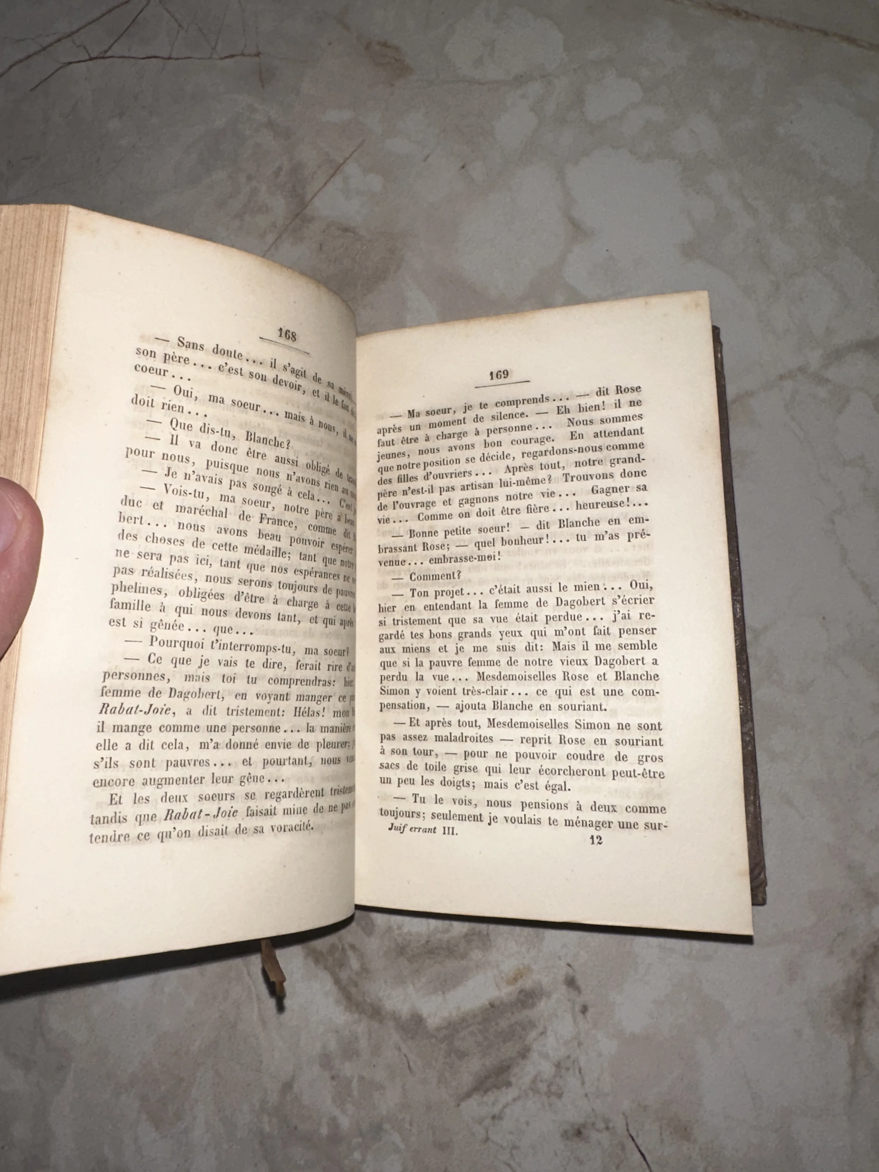 Перед вами подлинный фрагмент классики французской литературы — разворот из третьего тома знаменитого романа Эжена Сю. Страницы сохранили благородный оттенок слоновой кости и четкую антикварную печать, передающую дух книгоиздания XIX века. Этот экземпляр станет ценным дополнением коллекции старинных фолиантов и атмосферным предметом интерьера.