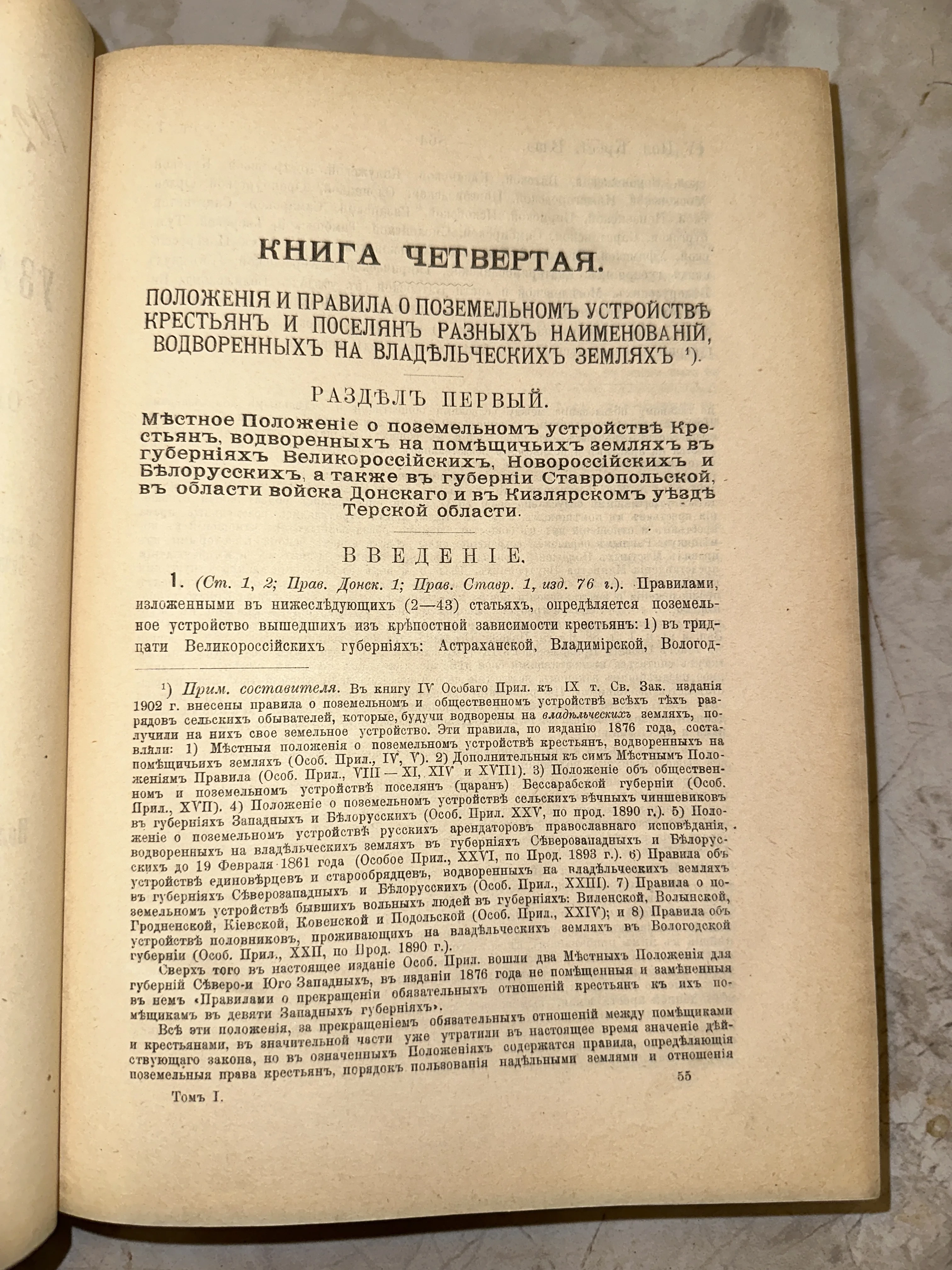 Разворот старинной книги с текстом на дореволюционном русском языке, заголовок «Книга четвертая. Положения и правила о поземельном устройстве крестьян».