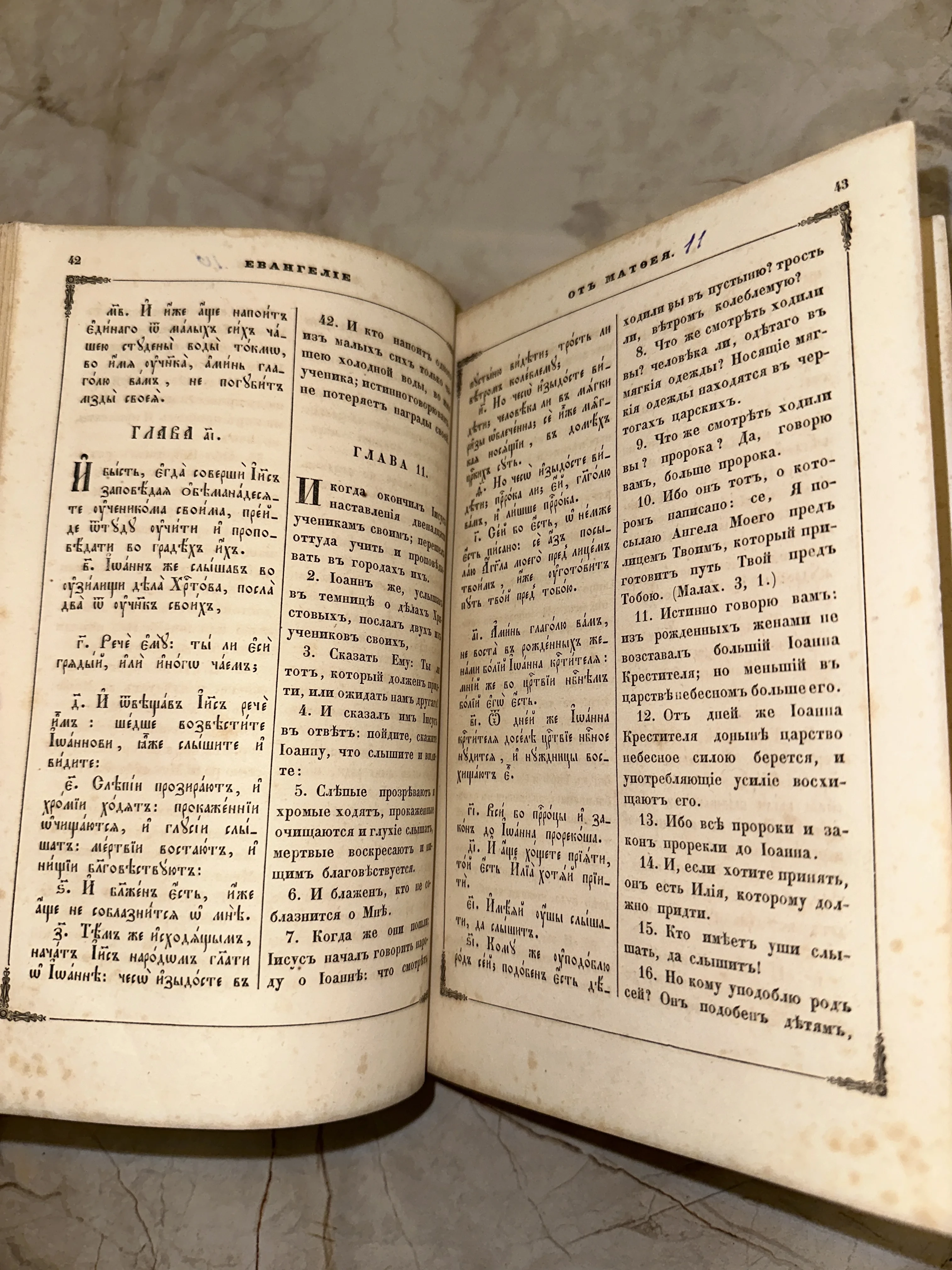 Этот экземпляр представляет собой редкое сочетание церковнославянского подлинника и синодального перевода, напечатанного дореволюционным шрифтом. Пожелтевшие от времени страницы с характерным крапом и следами бытования передают особую атмосферу старинной библиотеки. Книга сохранилась в хорошем состоянии, позволяя детально изучить типографские особенности и духовное наследие прошлого.
