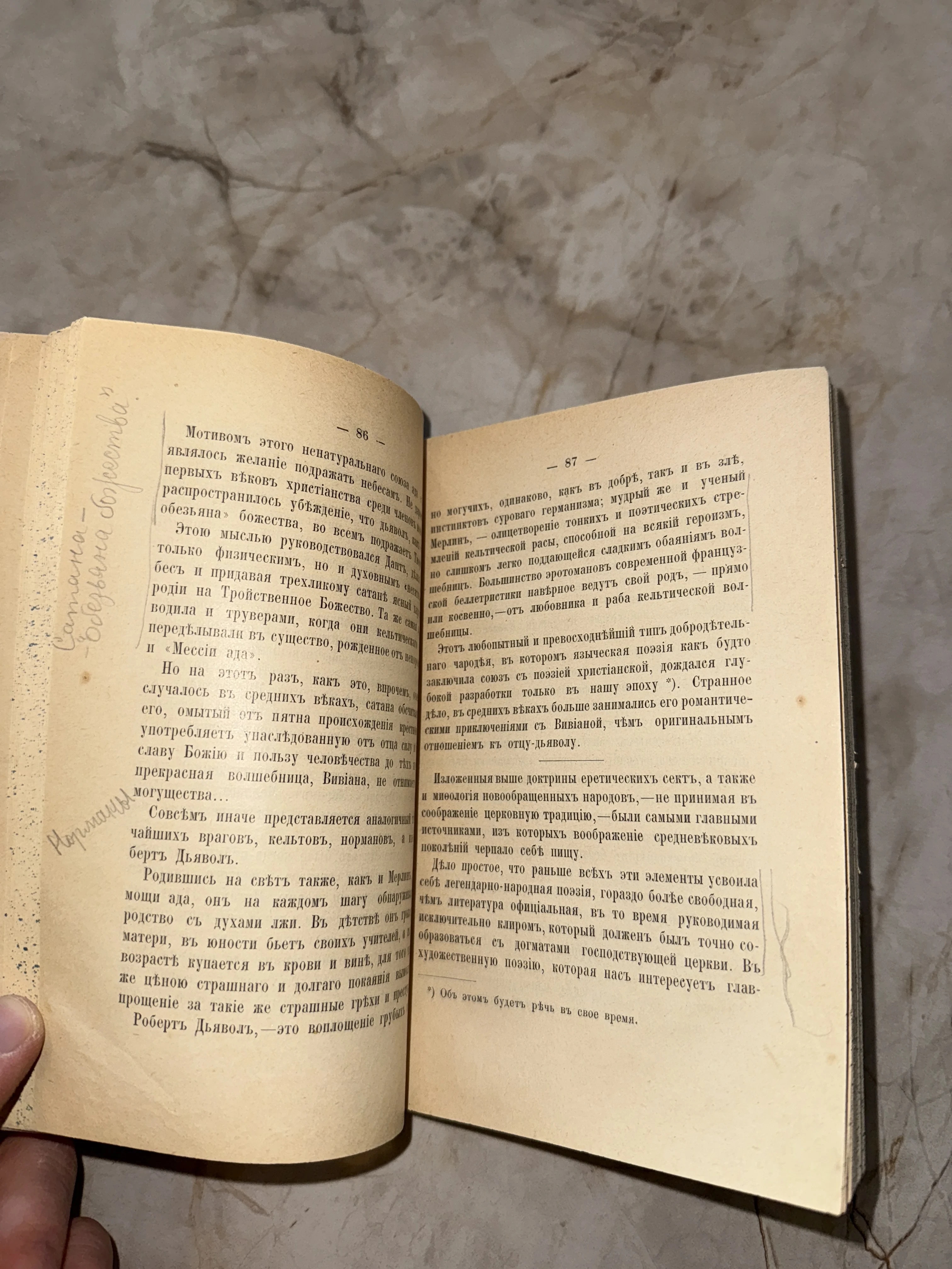 Уникальный разворот антикварного издания, посвященного исследованию средневековых верований, упоминающий легенды о Мерлине и Роберте Дьяволе. Сохранность страниц с характерной патиной времени и живыми пометками на полях создает неповторимую атмосферу соприкосновения с историей. Текст, напечатанный в дореволюционной орфографии, станет настоящей находкой для коллекционеров редкой литературы и библиофилов.