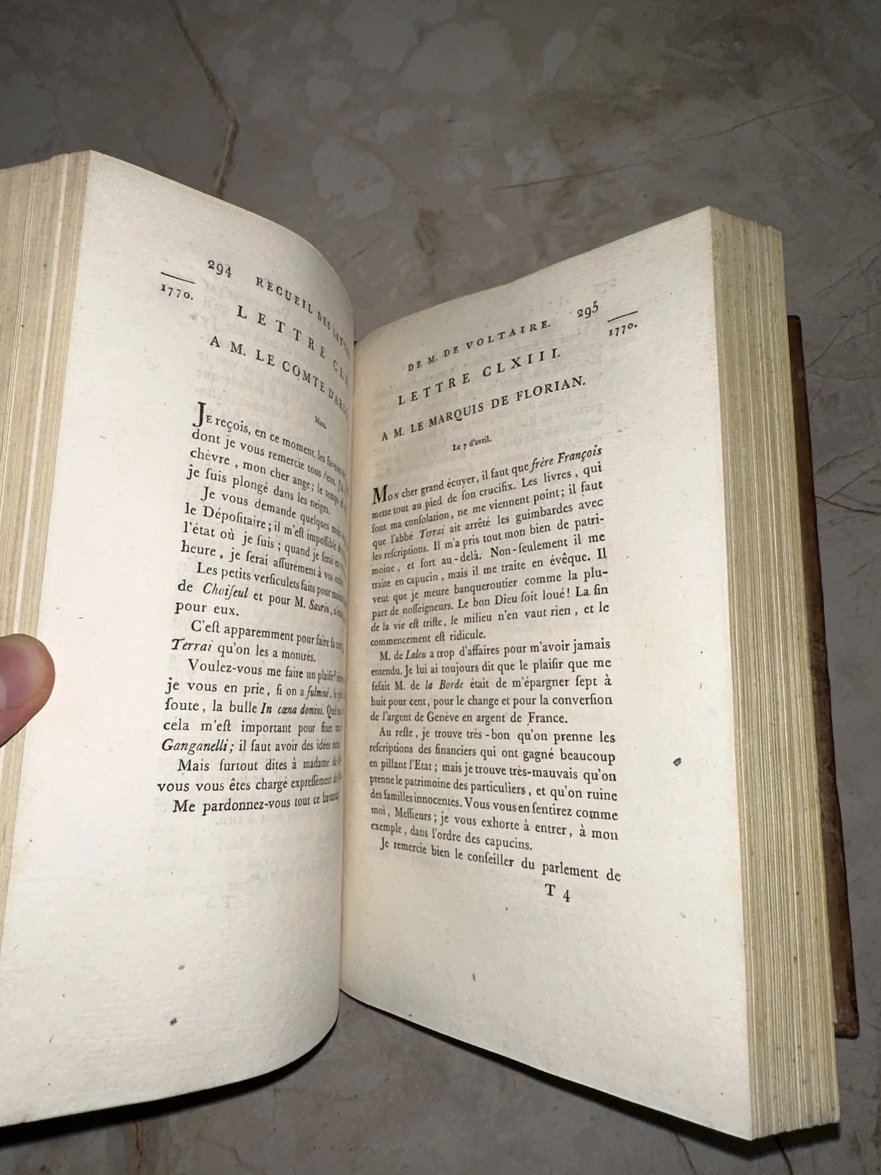 Разворот антикварной книги на французском языке с текстом писем Вольтера, напечатанный в 1770 году.
