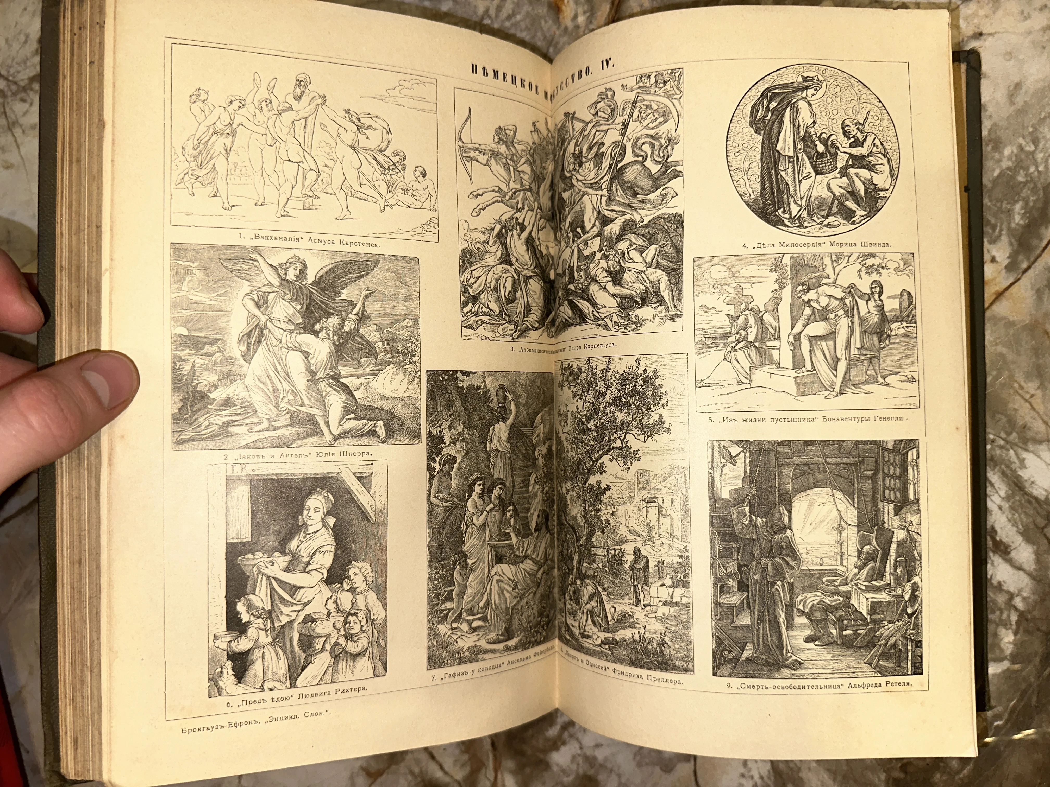 Разворот антикварной книги с черно-белыми репродукциями гравюр немецких художников XIX века, включая работы Шнорра и Рихтера.