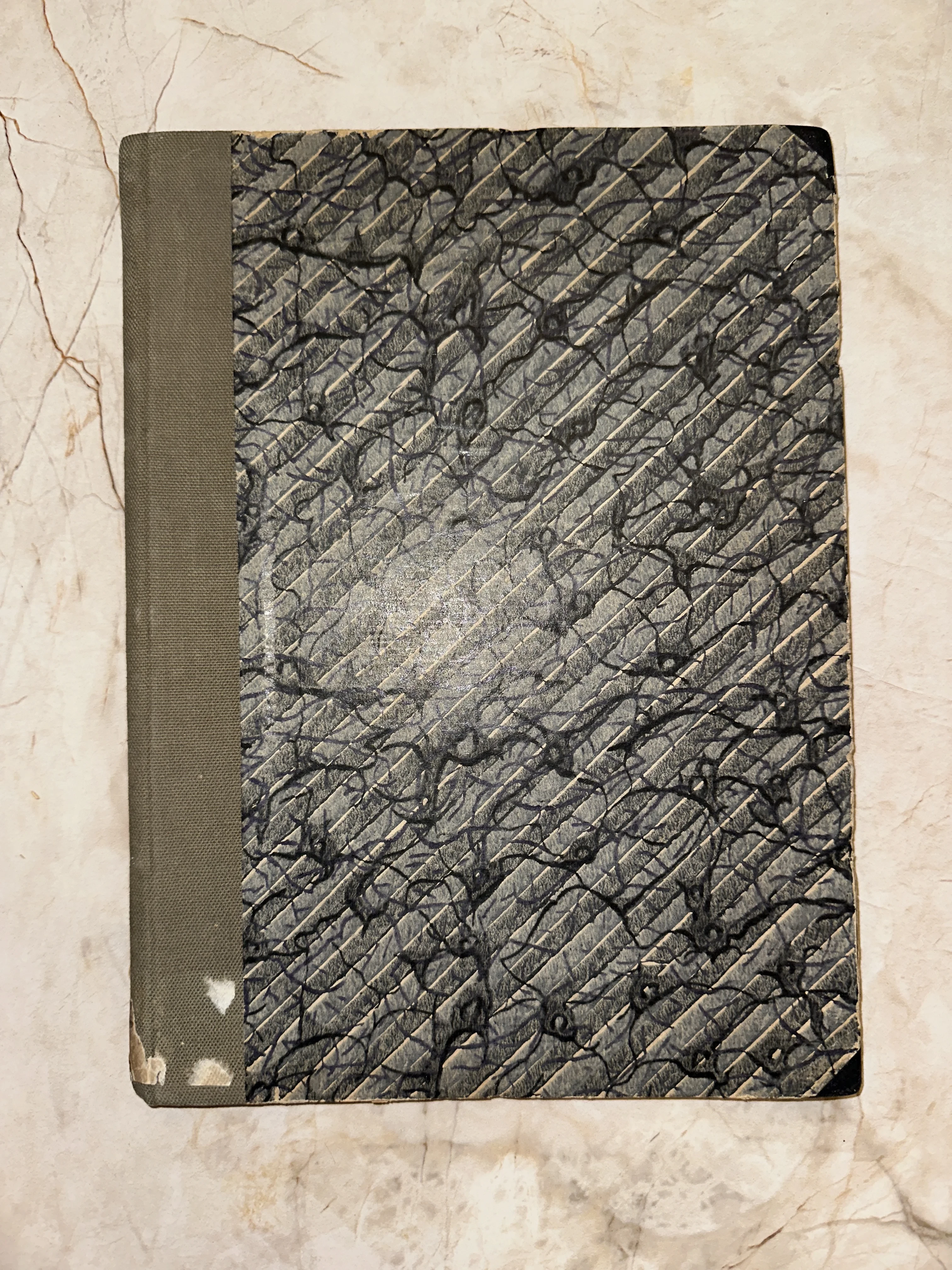 Обложка старинной книги с серым тканевым корешком и диагональным абстрактным орнаментом на мраморной бумаге.