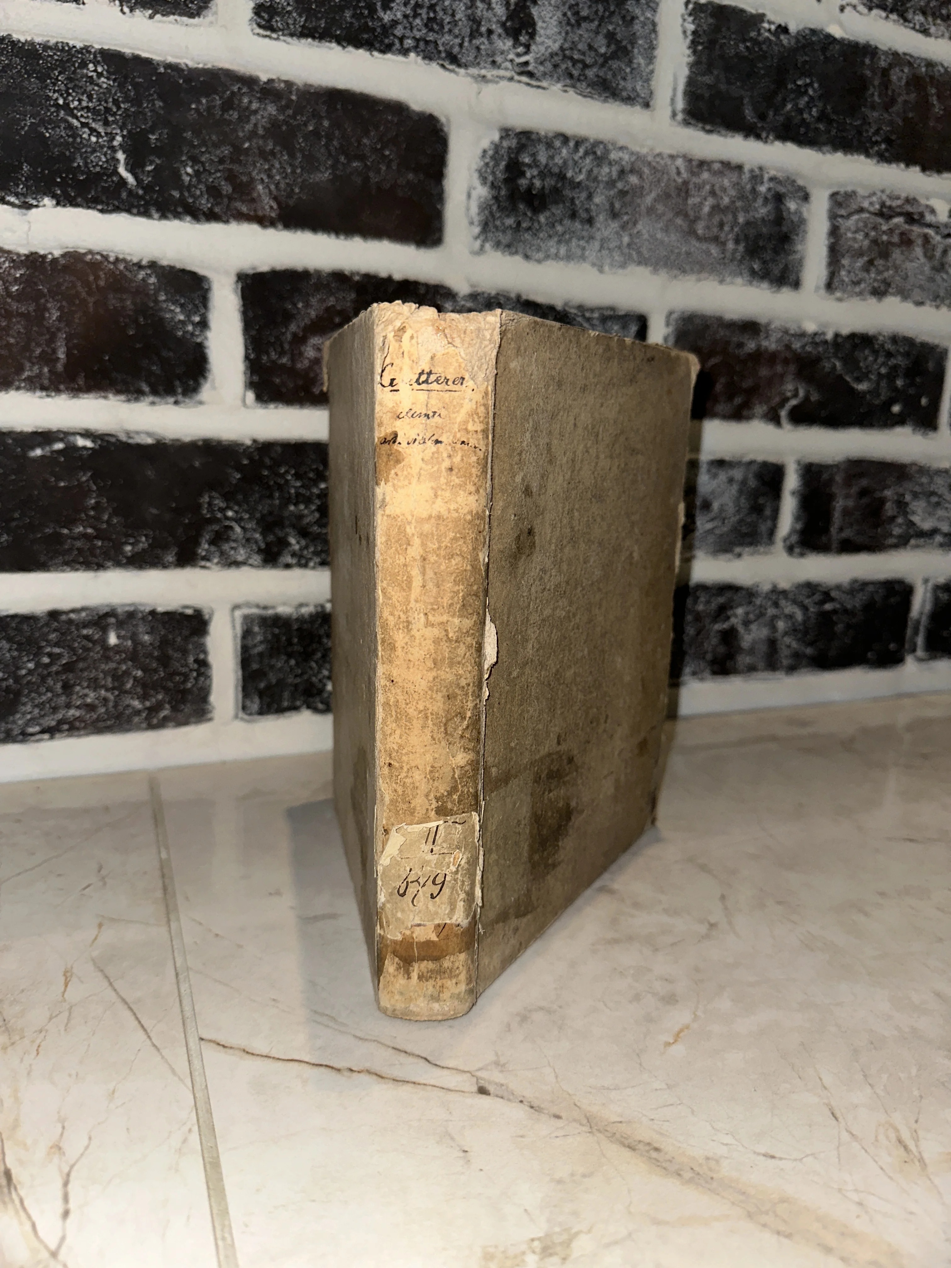 Старинная антикварная книга с пожелтевшим потертым корешком и рукописными пометками на фоне кирпичной стены.