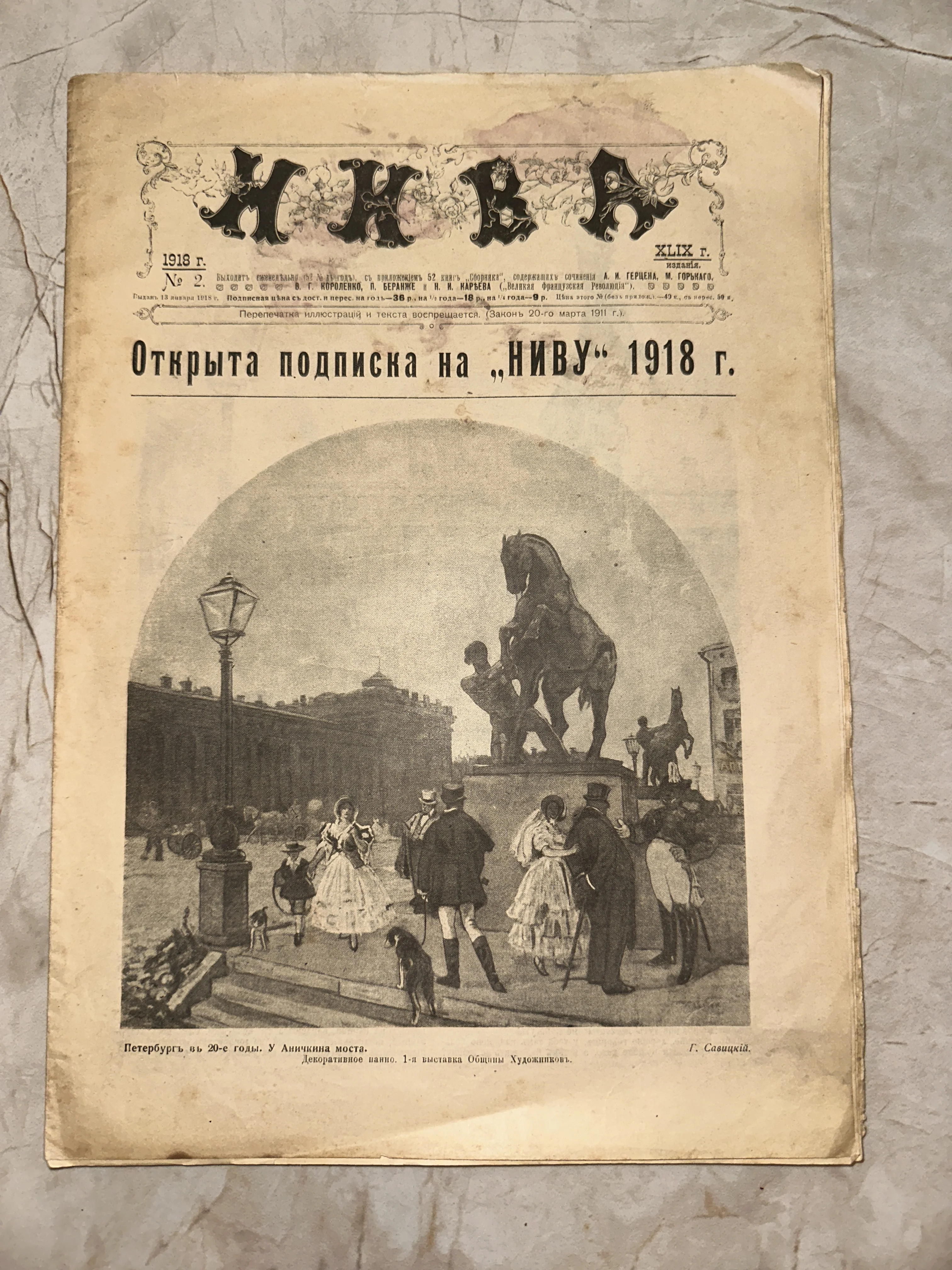 Редкий экземпляр легендарного издания, вышедший в переломный для истории России 1918 год. На обложке представлена художественная сцена прогулки у Аничкова моста в Петербурге XIX века, подчеркивающая преемственность культурных традиций. Состояние бумаги с характерной патиной времени и четкостью типографских шрифтов делает этот лот ценным дополнением частной коллекции.