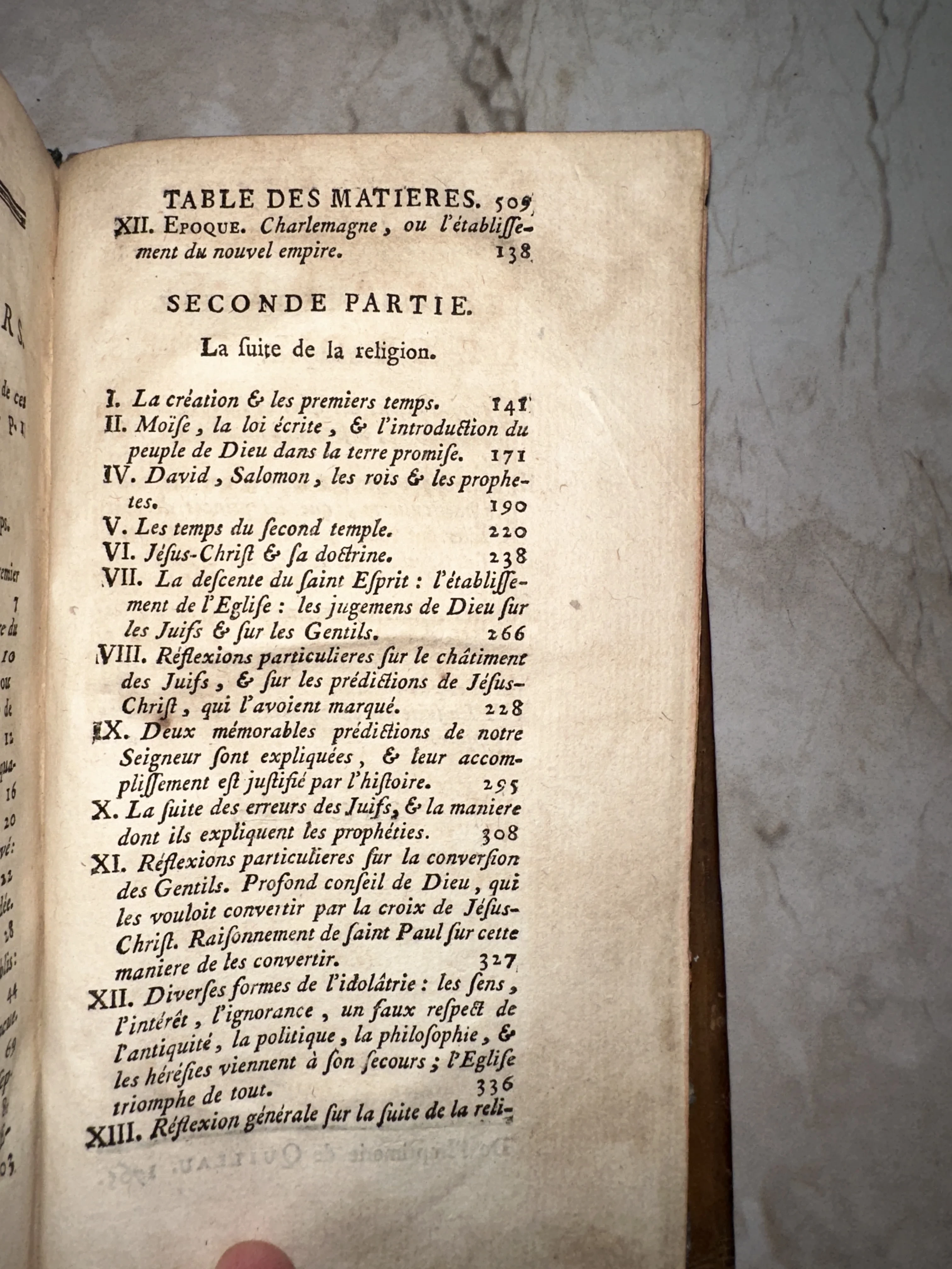 Страница антикварной книги на французском языке с заголовком Table des Matieres и списком глав, посвященных религии.
