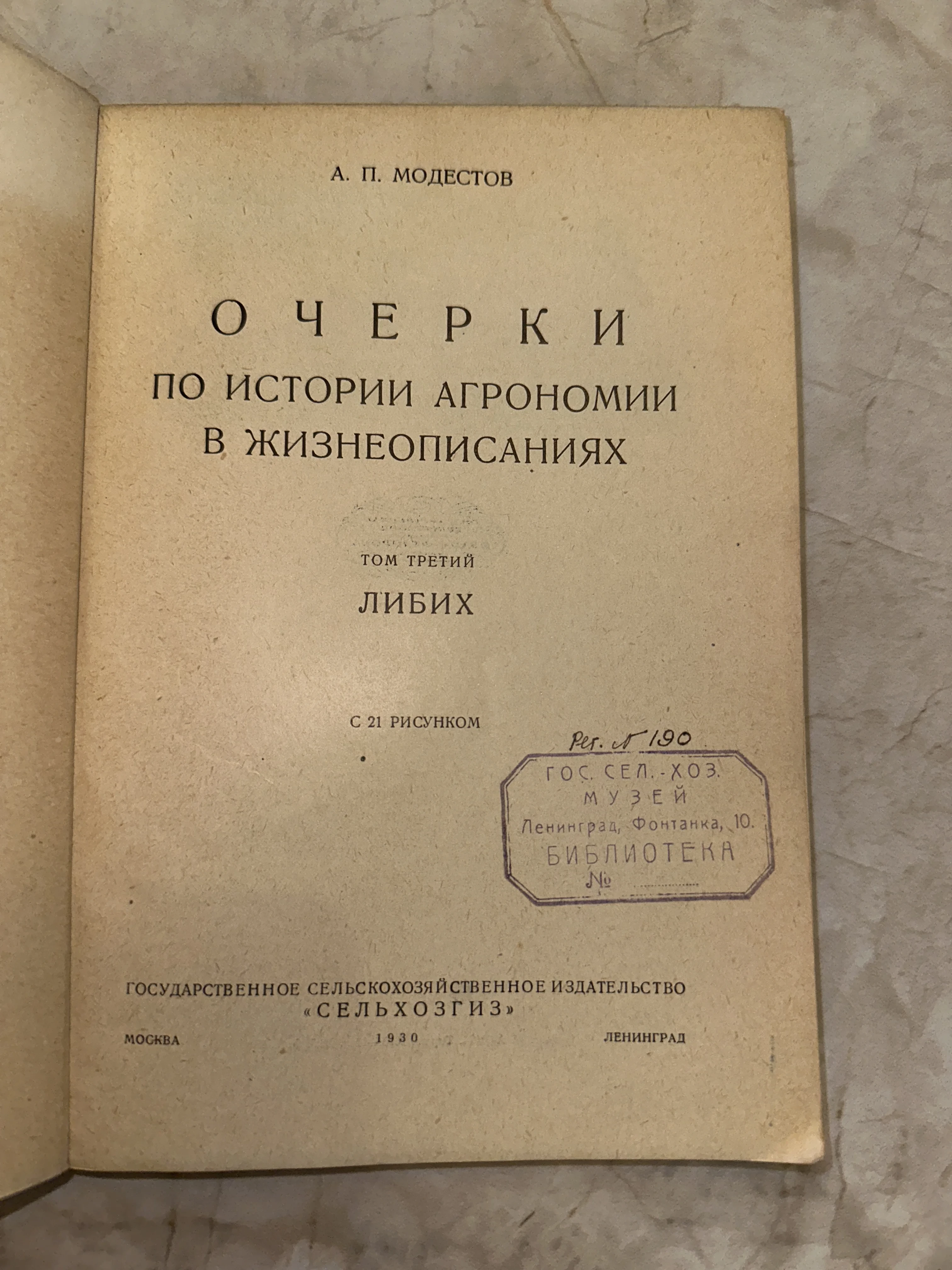 Титульный лист старинной книги А. П. Модестова «Очерки по истории агрономии в жизнеописаниях», том третий, со штампом музея.