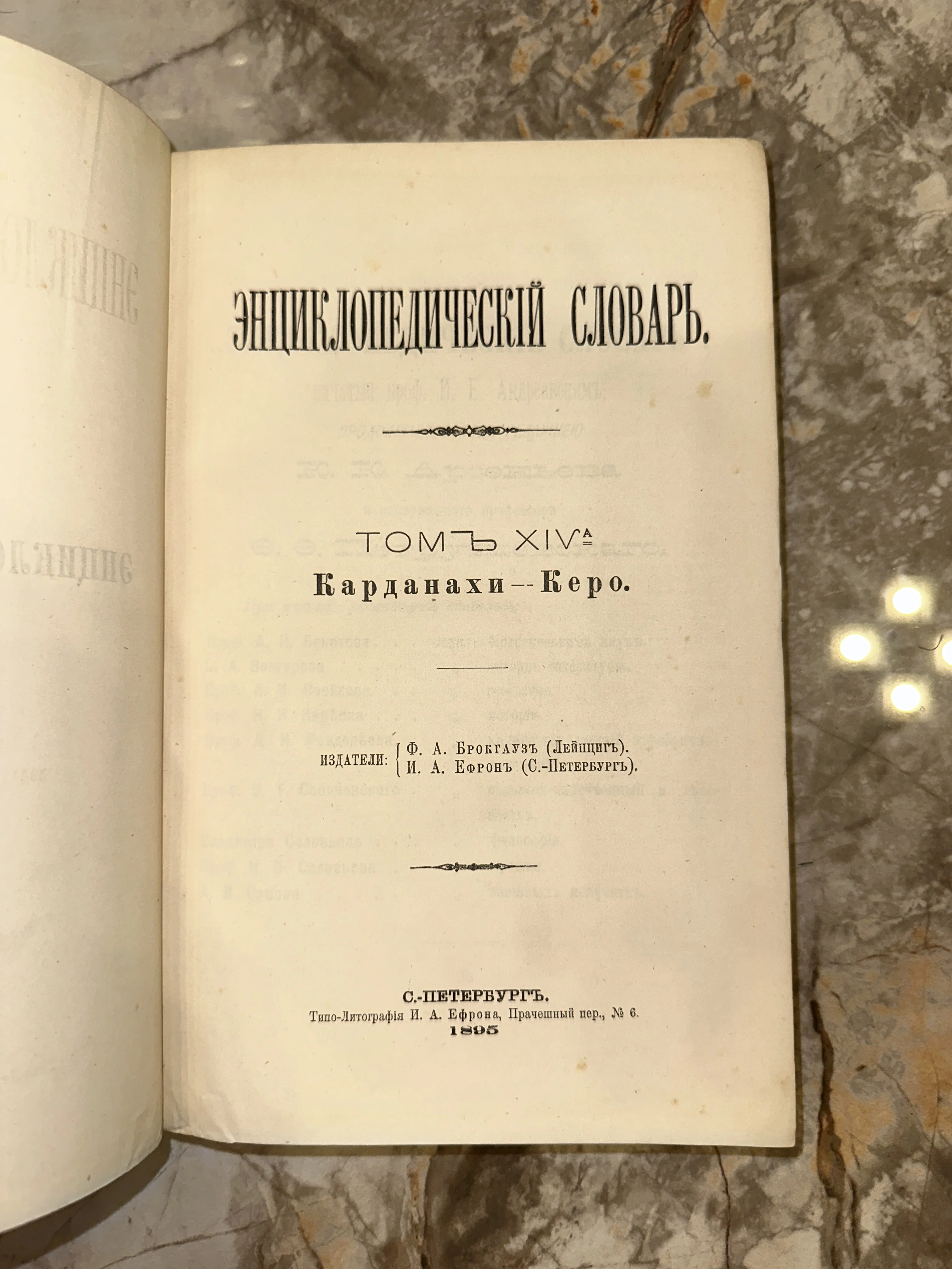 Титульный лист антикварного издания «Энциклопедический словарь» Брокгауза и Ефрона, том 14а, напечатанного в Санкт-Петербурге в 1895 году.