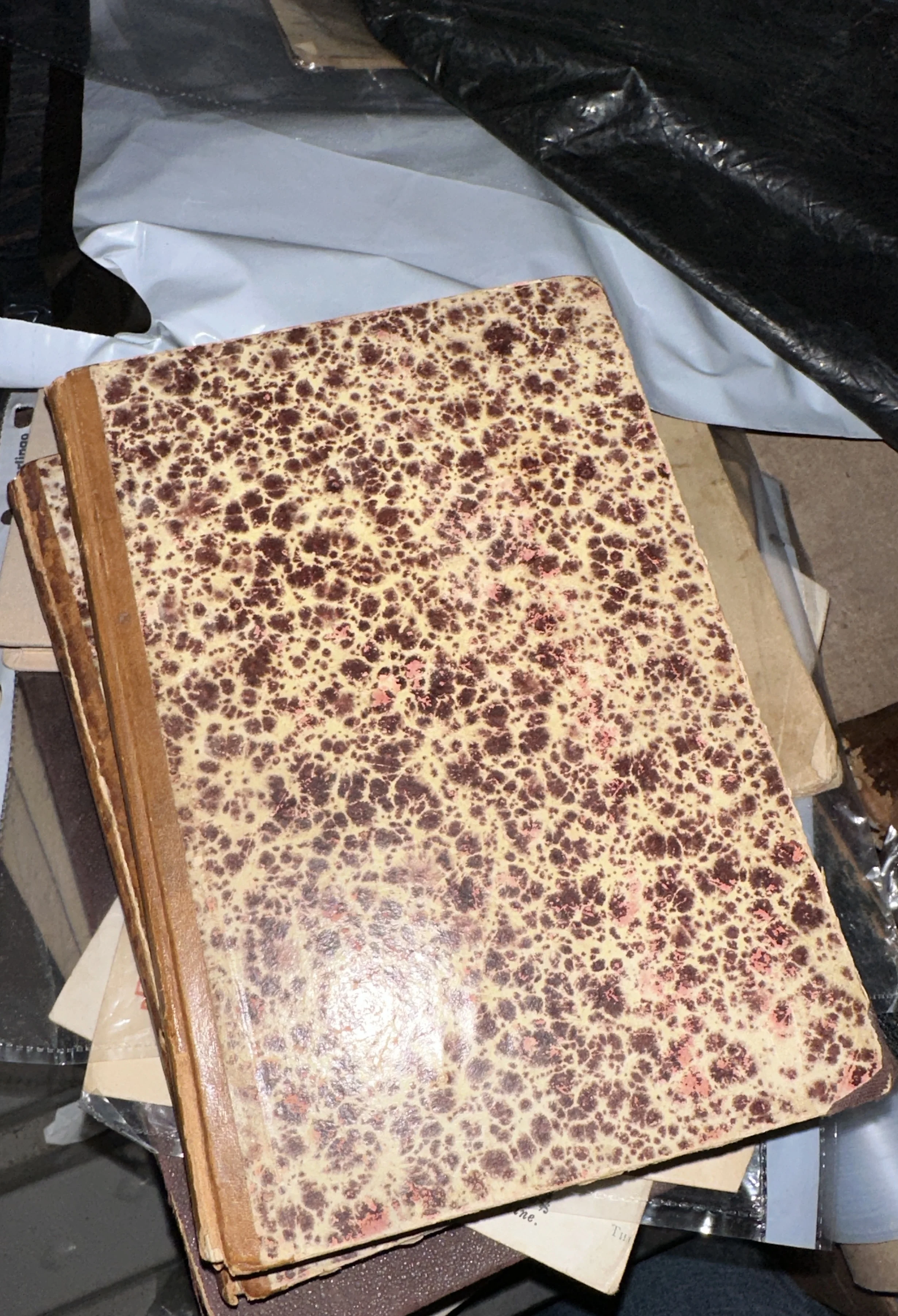 Изящный образец книжного переплета прошлых столетий с характерным узором «под мрамор» и благородными следами времени. Потертости на корешке и углах придают изданию особый антикварный шарм, свидетельствуя о его долгой истории. Такой предмет станет достойным украшением частной библиотеки или атмосферным реквизитом для ценителей старины.