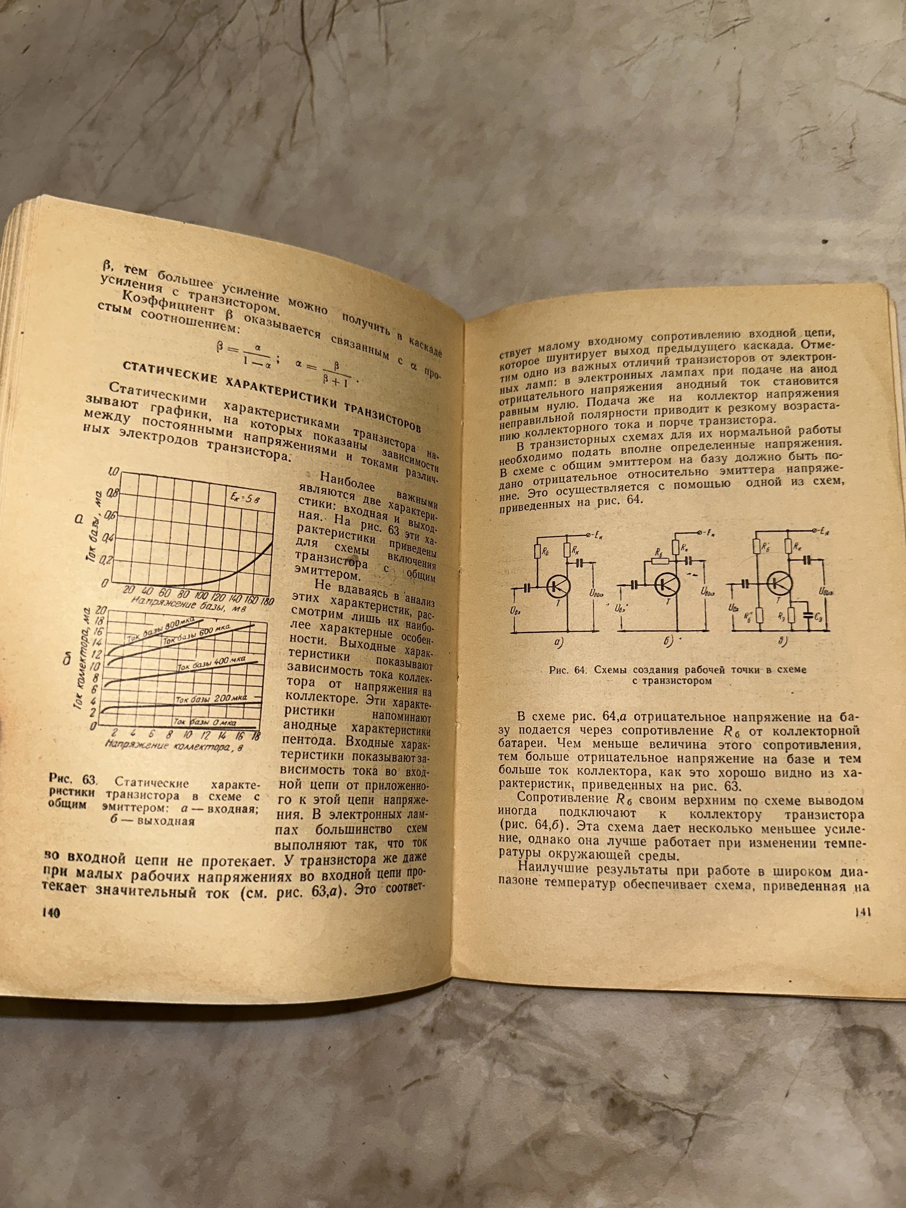 Разворот старой книги на русском языке со схемами и графиками характеристик транзисторов.