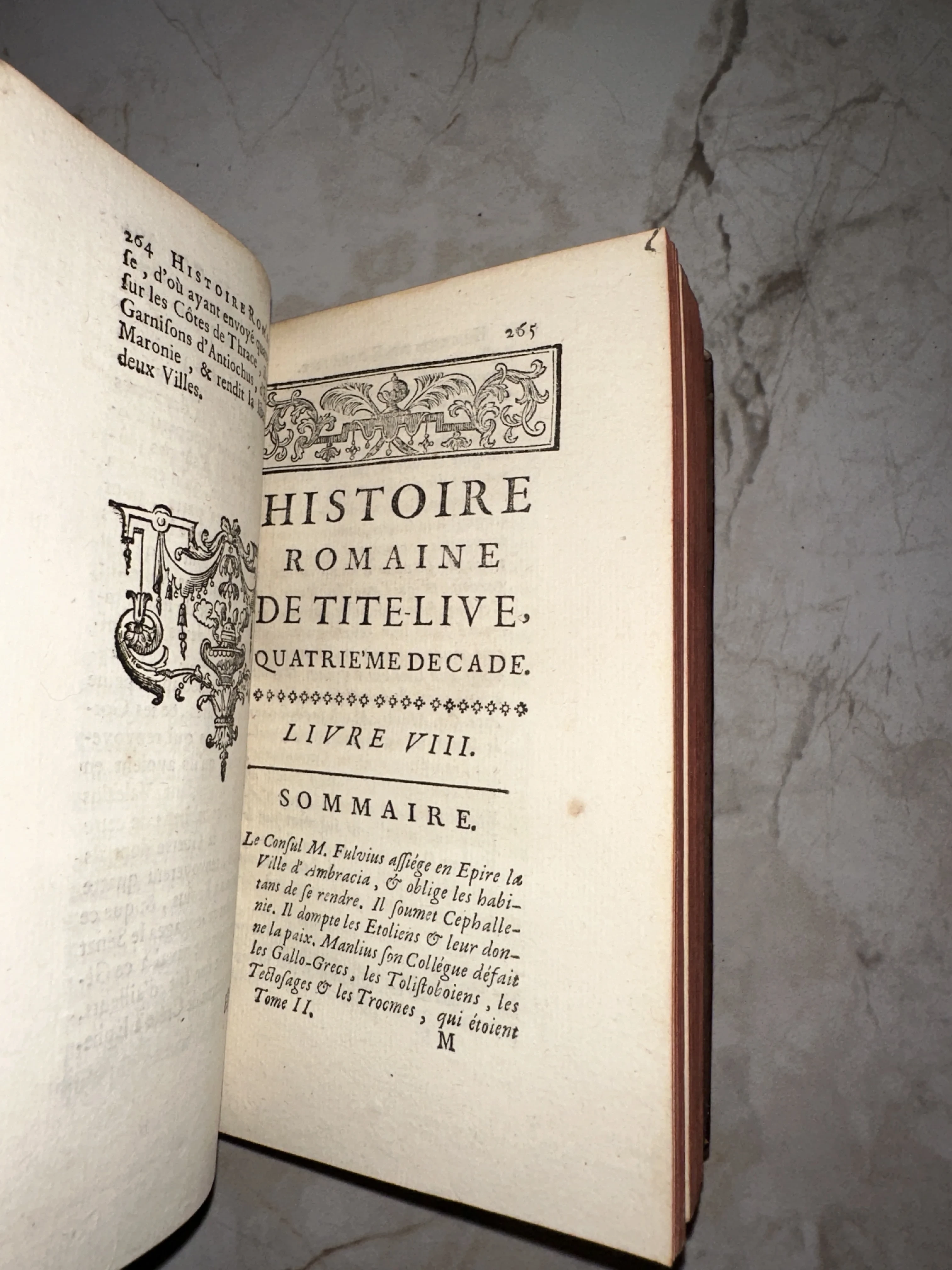 Редкий экземпляр классического труда Тита Ливия, напечатанный на благородной бумаге с сохранившейся фактурой времени. Страницы украшены изящными гравированными заставками и виньетками, характерными для европейского книгопечатания XVIII века. Издание представляет высокую коллекционную ценность для любителей античной истории и старинной полиграфии.