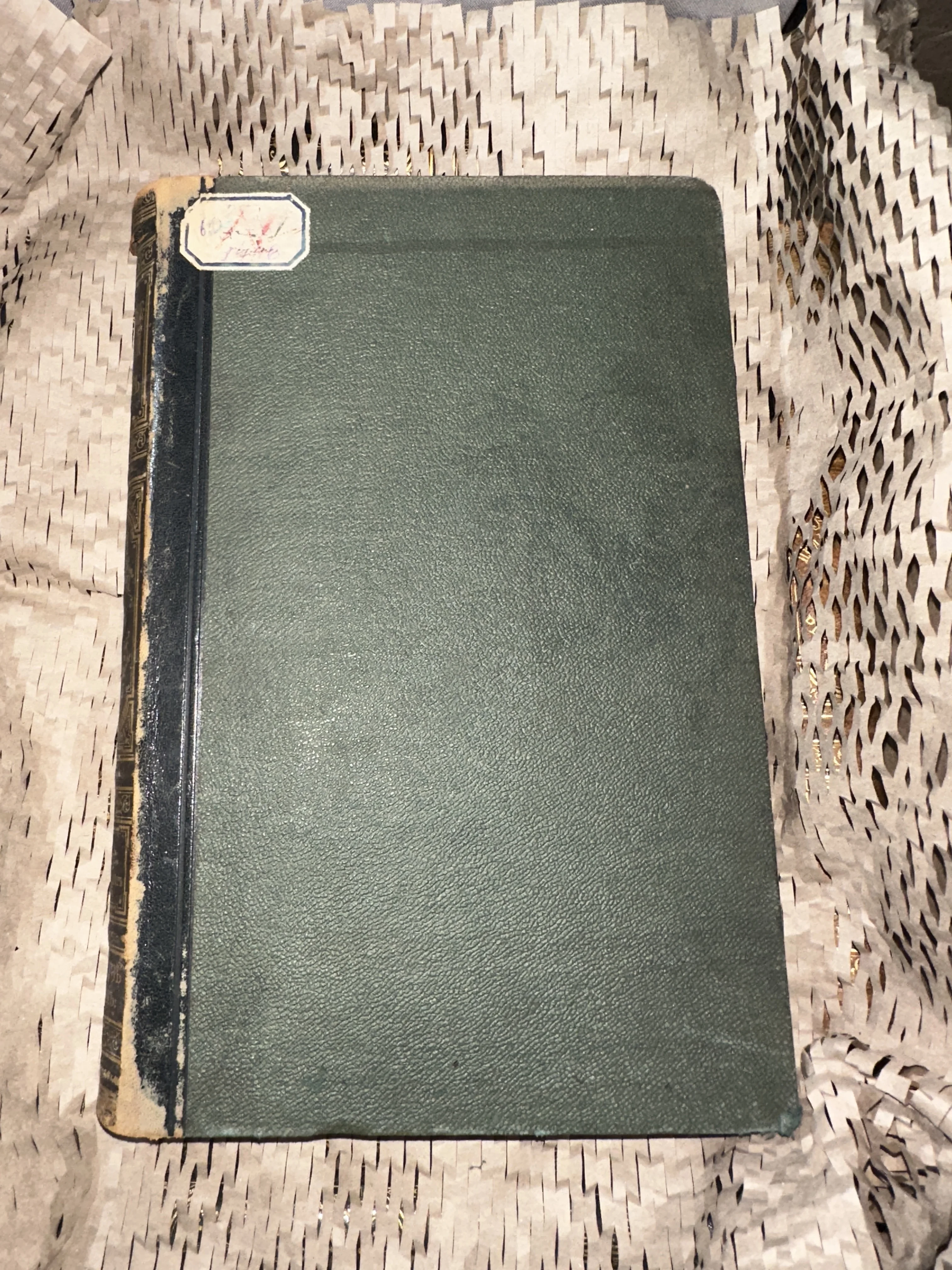 Вид сверху на антикварную книгу с темно-зеленой фактурной обложкой, потертым темным корешком и бумажным ярлыком в углу.