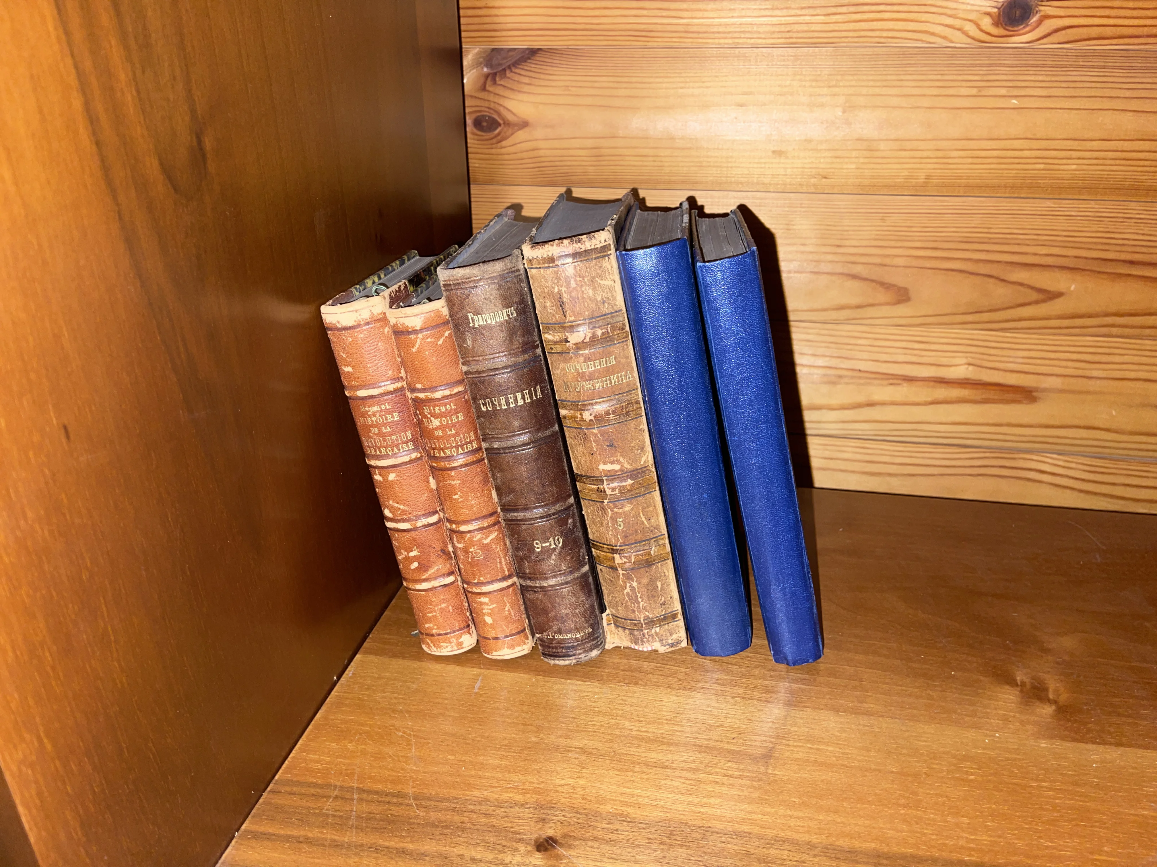 Ряд старинных книг с тиснеными кожаными корешками на деревянной полке, среди которых сочинения Григоровича и Дружинина.