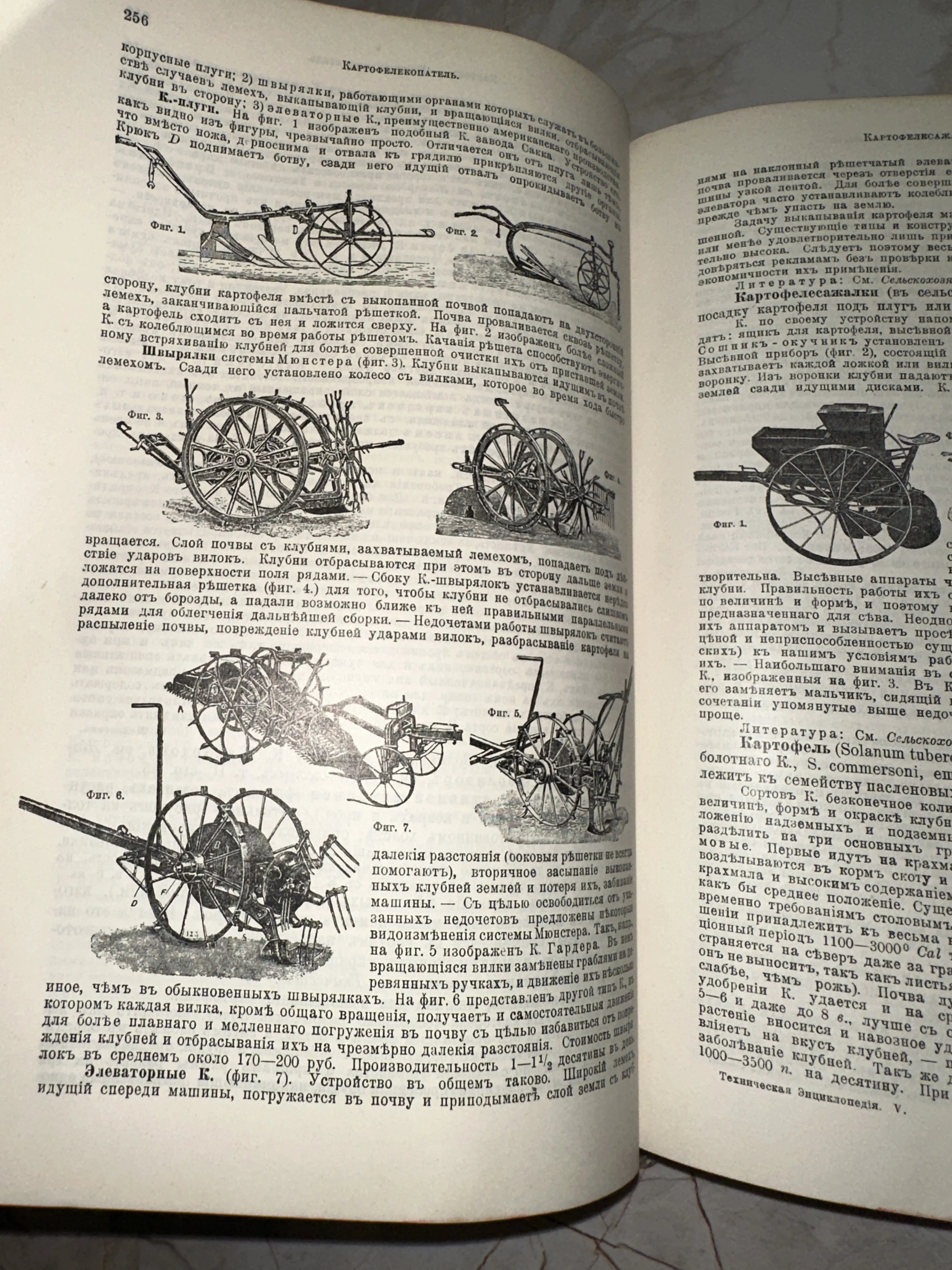 Перед вами подлинный фрагмент истории прогресса — страницы технической энциклопедии начала XX века с детальными гравюрами картофелесажалок. Текст, набранный в дореволюционной орфографии, и четкие схемы механизмов передают строгую эстетику индустриальной эпохи и прекрасно сохранили дух времени.