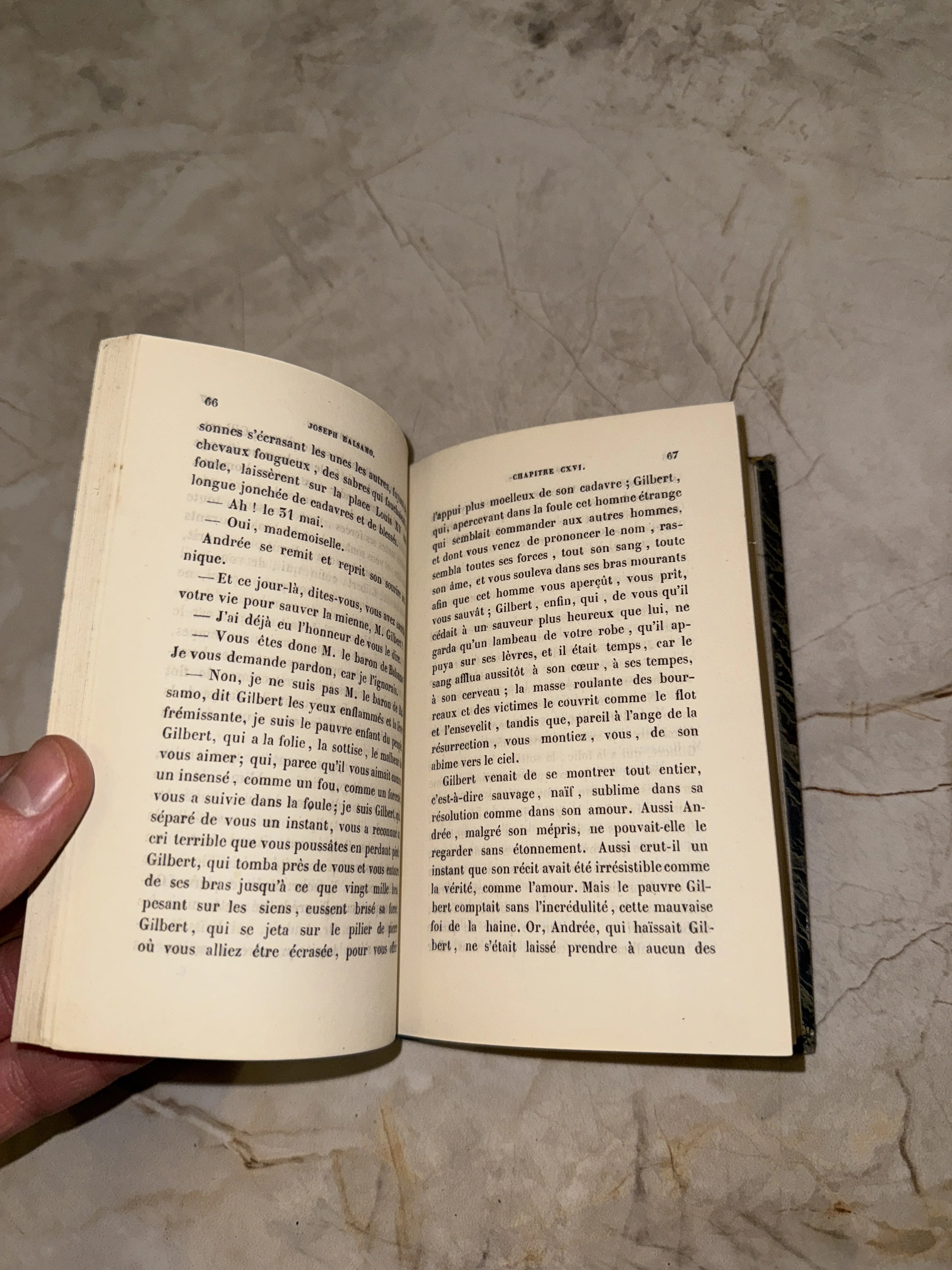 Разворот старинной книги на французском языке с текстом романа Жозеф Бальзамо на фоне мраморного стола.