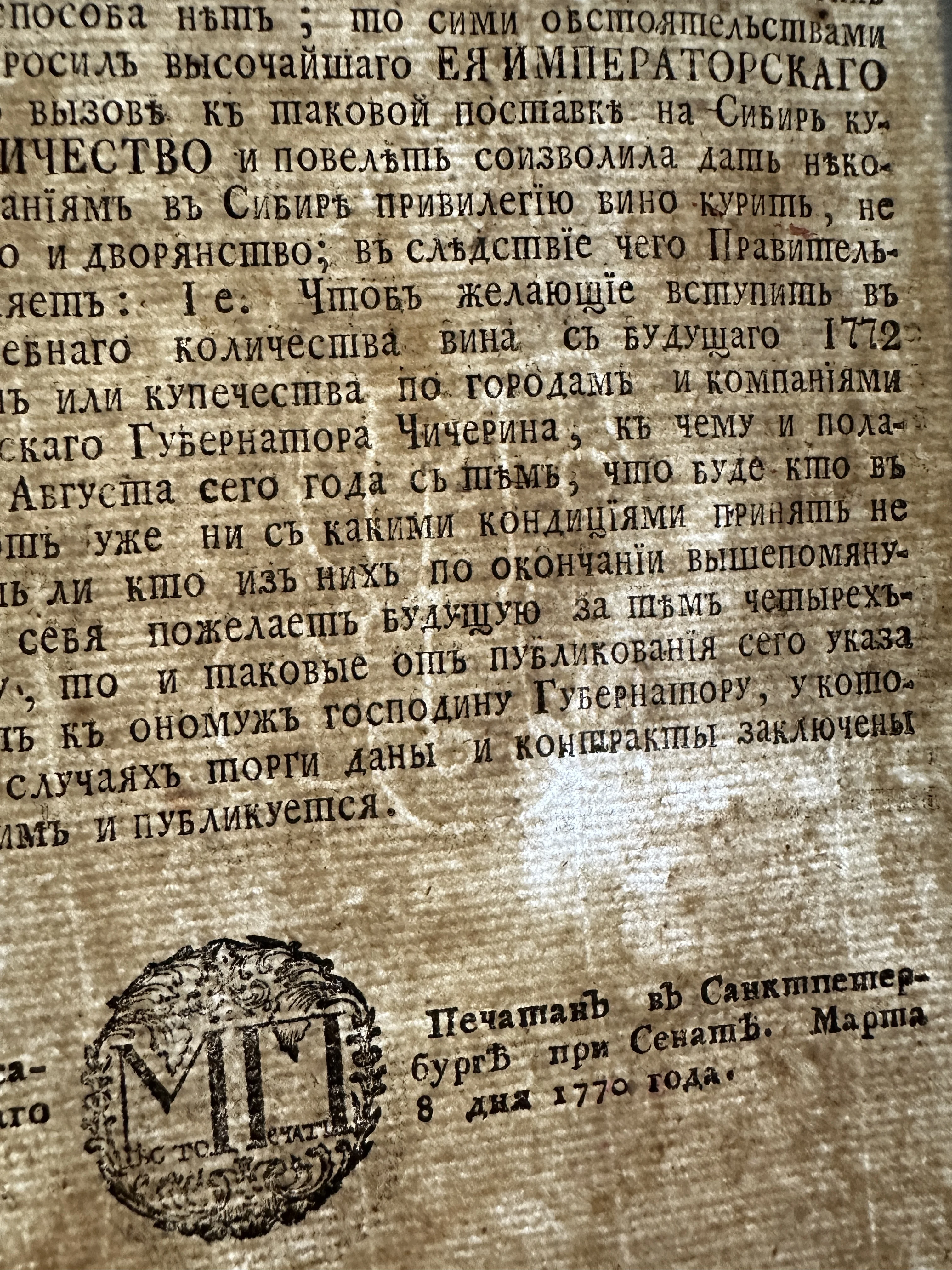 Подлинный фрагмент истории екатерининской эпохи, напечатанный в типографии Сената 8 марта 1770 года. Текст посвящен вопросам винокурения и торговых привилегий в Сибири, сохраняя на себе благородную патину времени и четкий оттиск старинного шрифта на плотной бумаге верже.