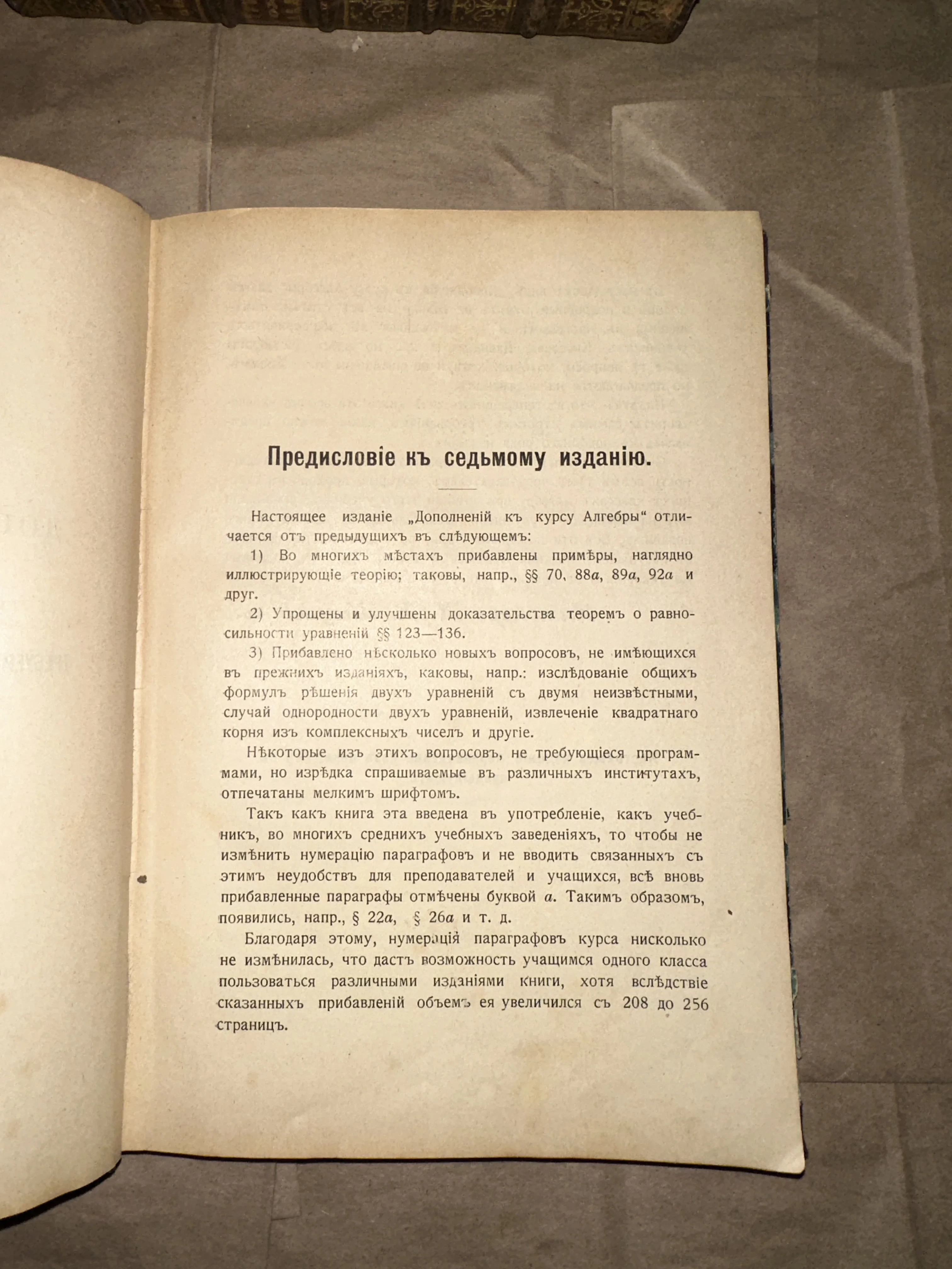 Перед вами страница из редкого дореволюционного учебного пособия, сохранившая дух академической строгости начала XX века. Плотная бумага с благородной патиной времени и классическая типографика с характерными «ятями» делают это издание ценным артефактом для коллекционеров научной литературы. Текст предисловия раскрывает уникальные методические особенности преподавания математики в старой России.