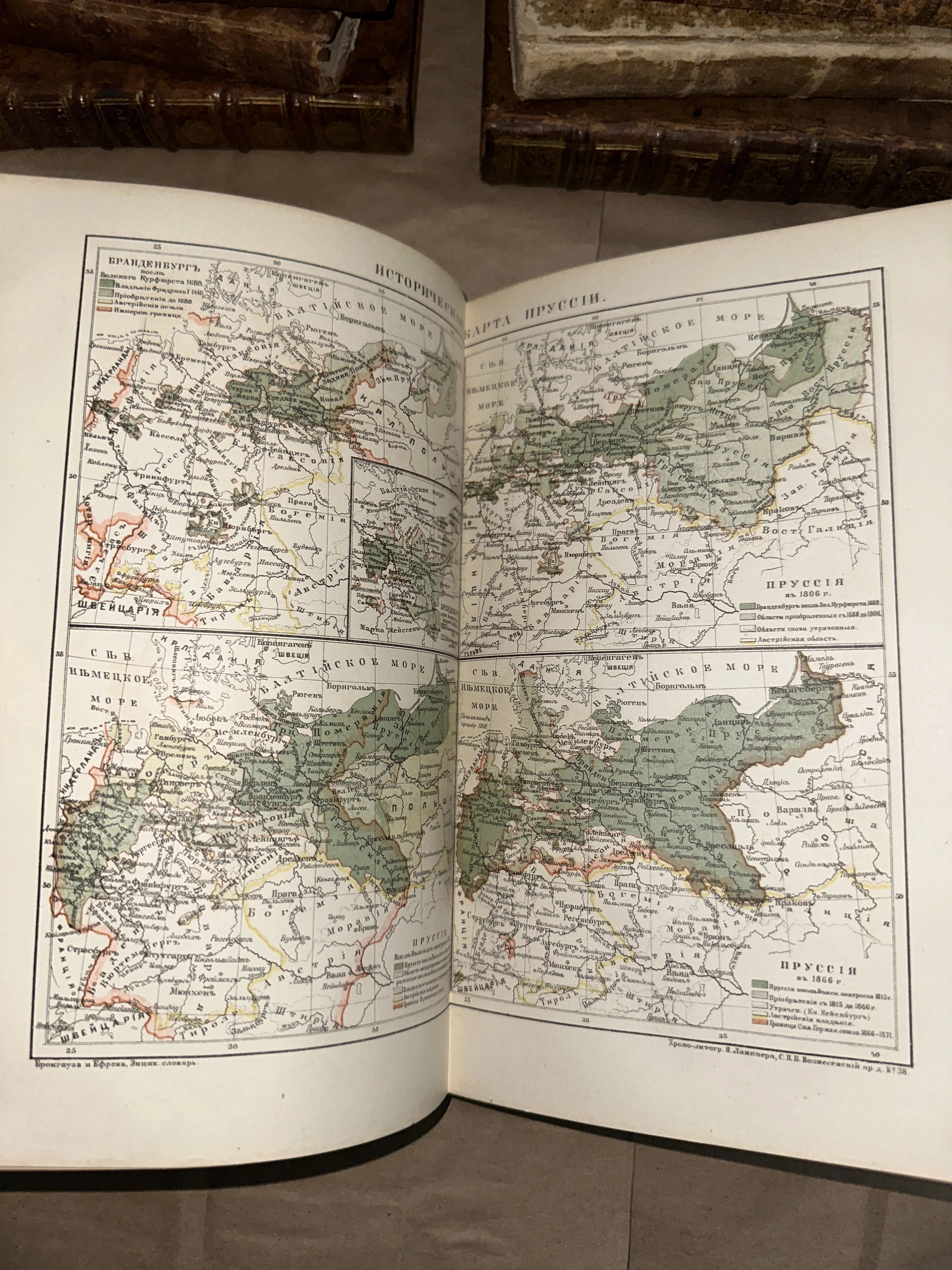 Перед вами уникальный разворот из знаменитого энциклопедического словаря Брокгауза и Ефрона с детальными хромолитографиями карт Пруссии и Бранденбурга. Тонкая прорисовка границ, превосходная сохранность бумаги и дореволюционная орфография делают этот экземпляр ценным артефактом для ценителей картографии и истории.