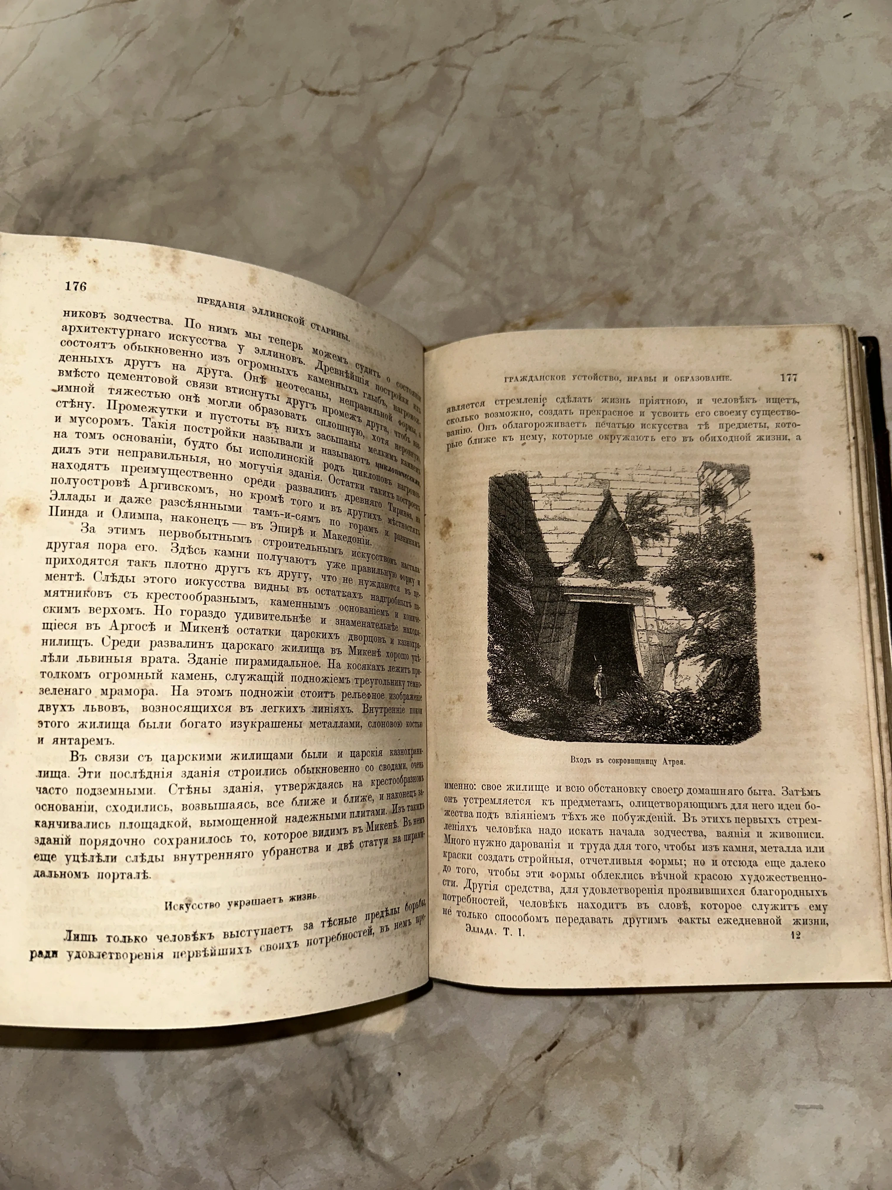 Разворот антикварной книги с дореволюционным шрифтом и гравюрой, изображающей вход в сокровищницу Атрея в Микенах.