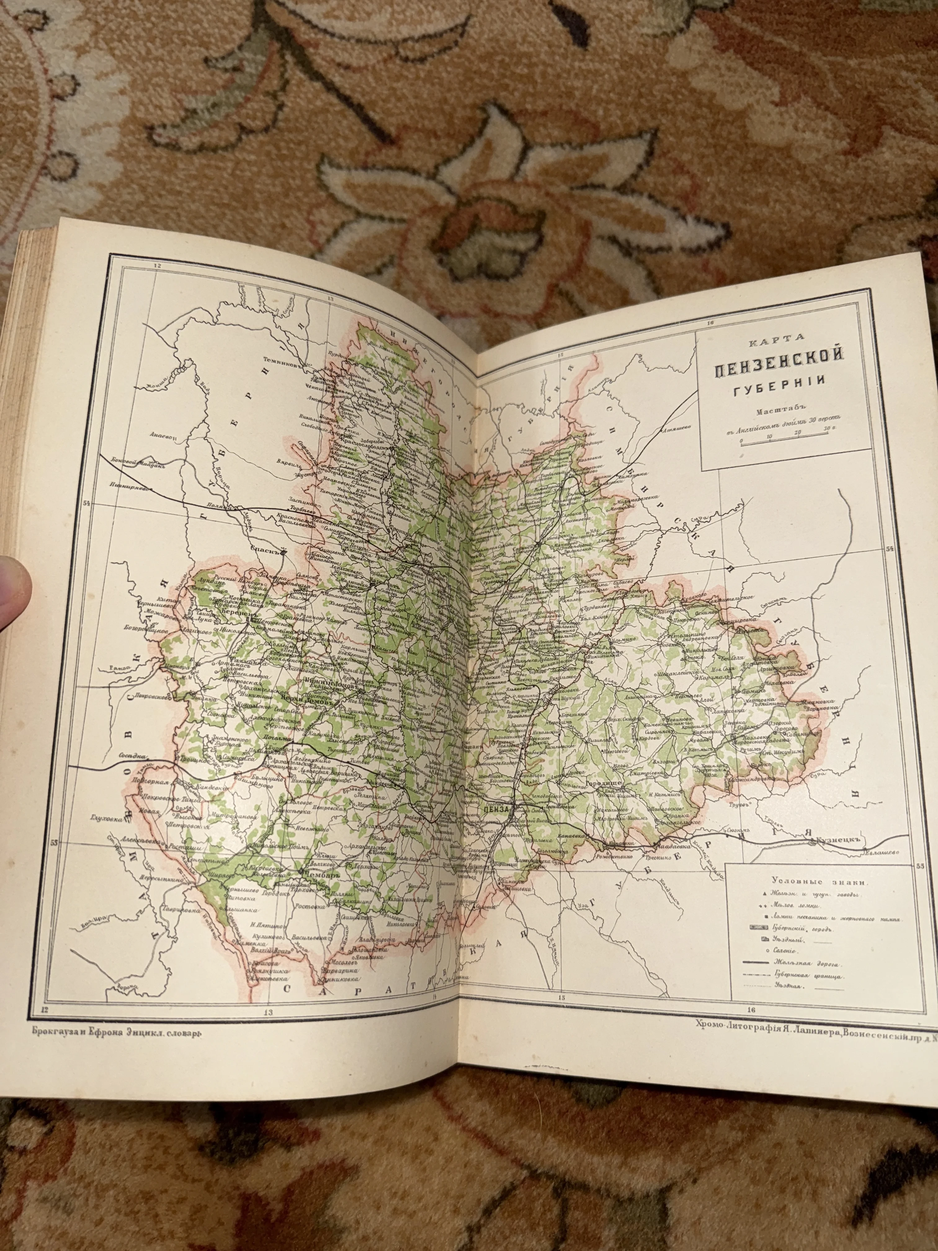 Разворот антикварного энциклопедического словаря с цветной литографированной картой Пензенской губернии.