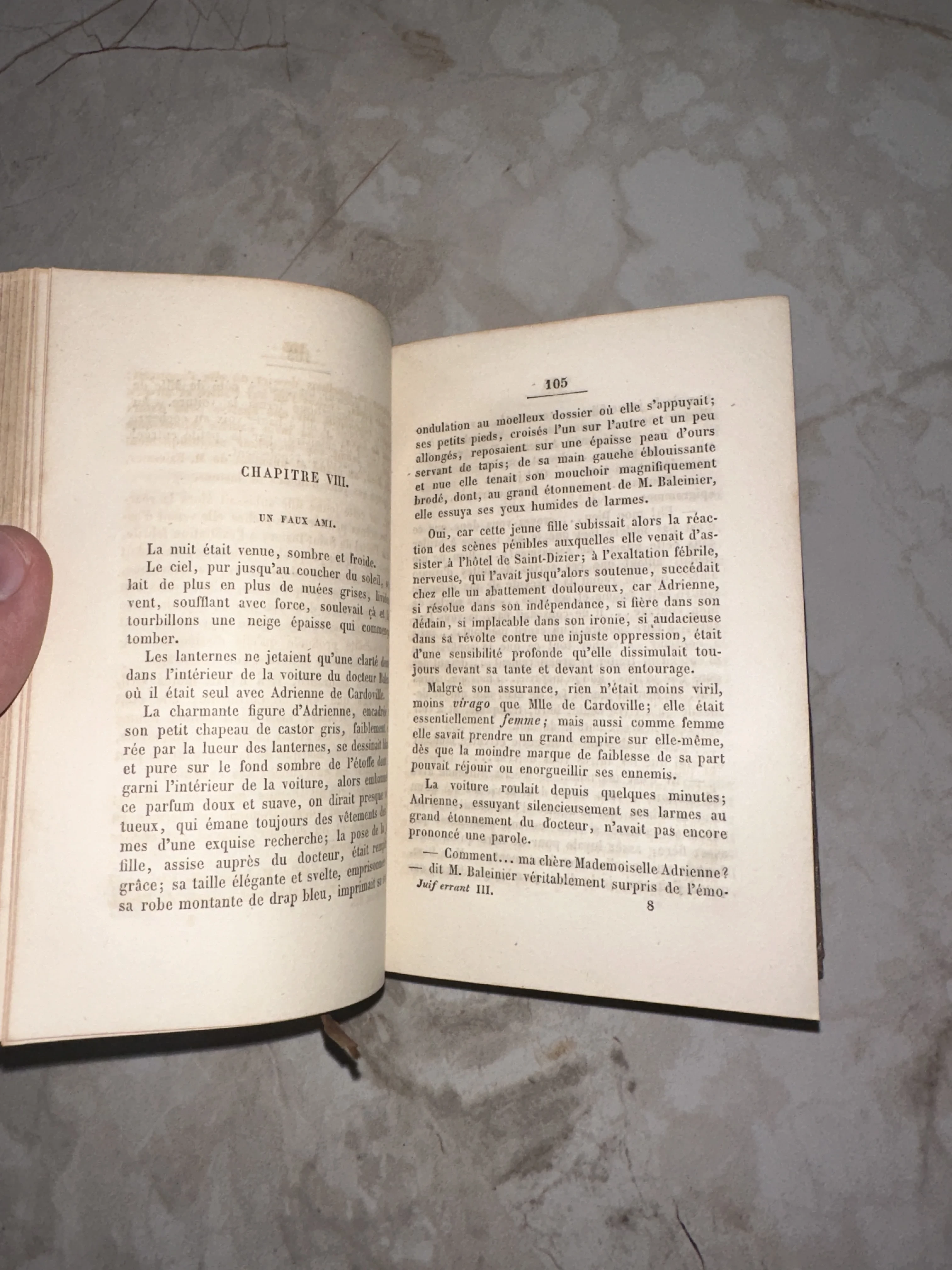 Элегантный разворот французского издания XIX века с четкой антиквенной типографикой и характерным благородным пожелтением бумаги. Текст главы «Un faux ami» из знаменитого романа Эжена Сю сохранил идеальную читаемость, передавая дух классической европейской литературы. Прекрасный образец книгопечатного искусства для ценителей старинных фолиантов.
