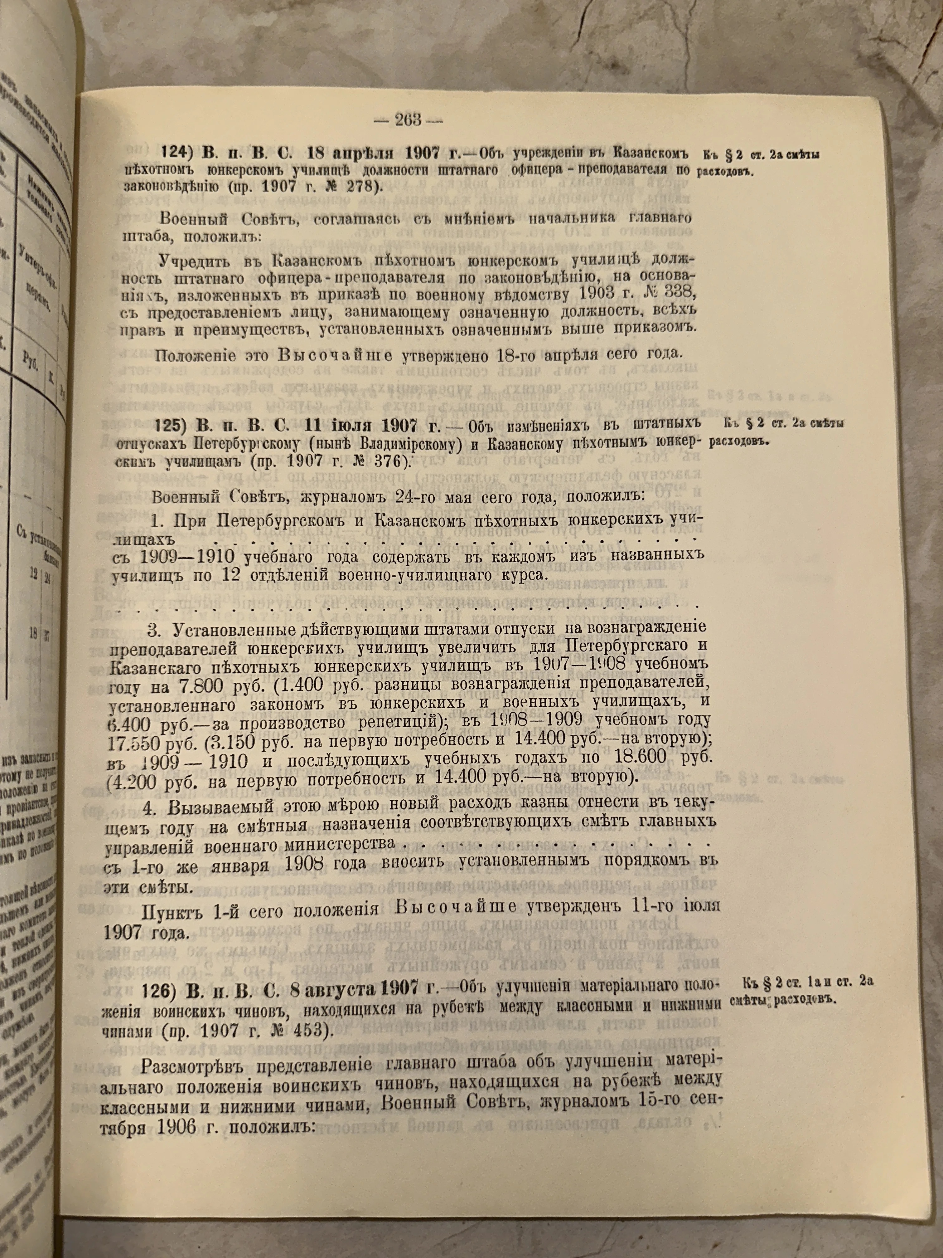 Аутентичный фрагмент официального военного издания Российской империи с четким типографским шрифтом начала XX века. Страница содержит указы об учреждении должностей и штатных изменениях в Казанском и Петербургском юнкерских училищах, утвержденные Николаем II. Плотная бумага с благородным оттенком времени станет отличным дополнением коллекции военно-исторических документов.