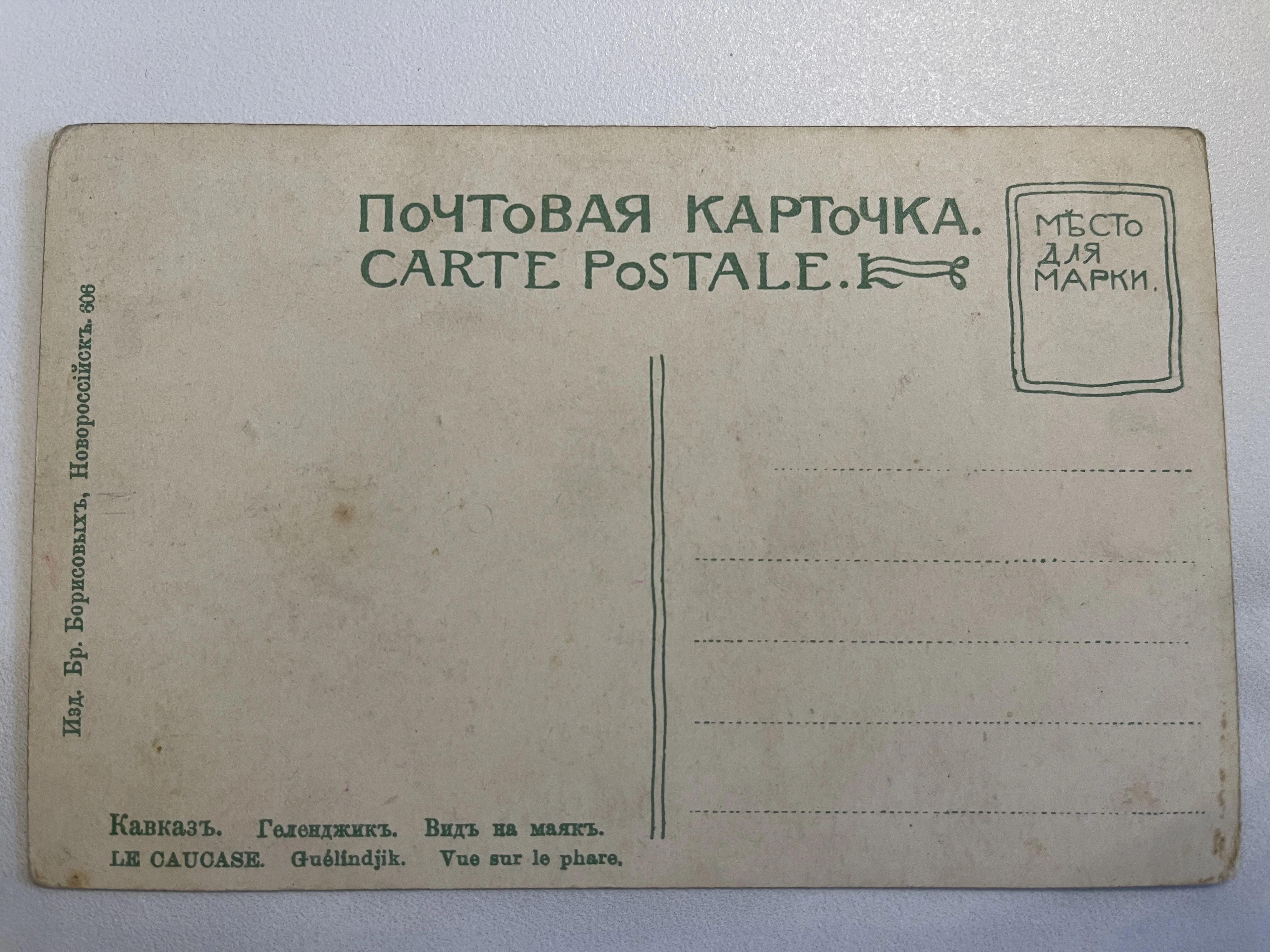 Оборотная сторона антикварной почтовой карточки с дореволюционным шрифтом и текстом о Геленджике.