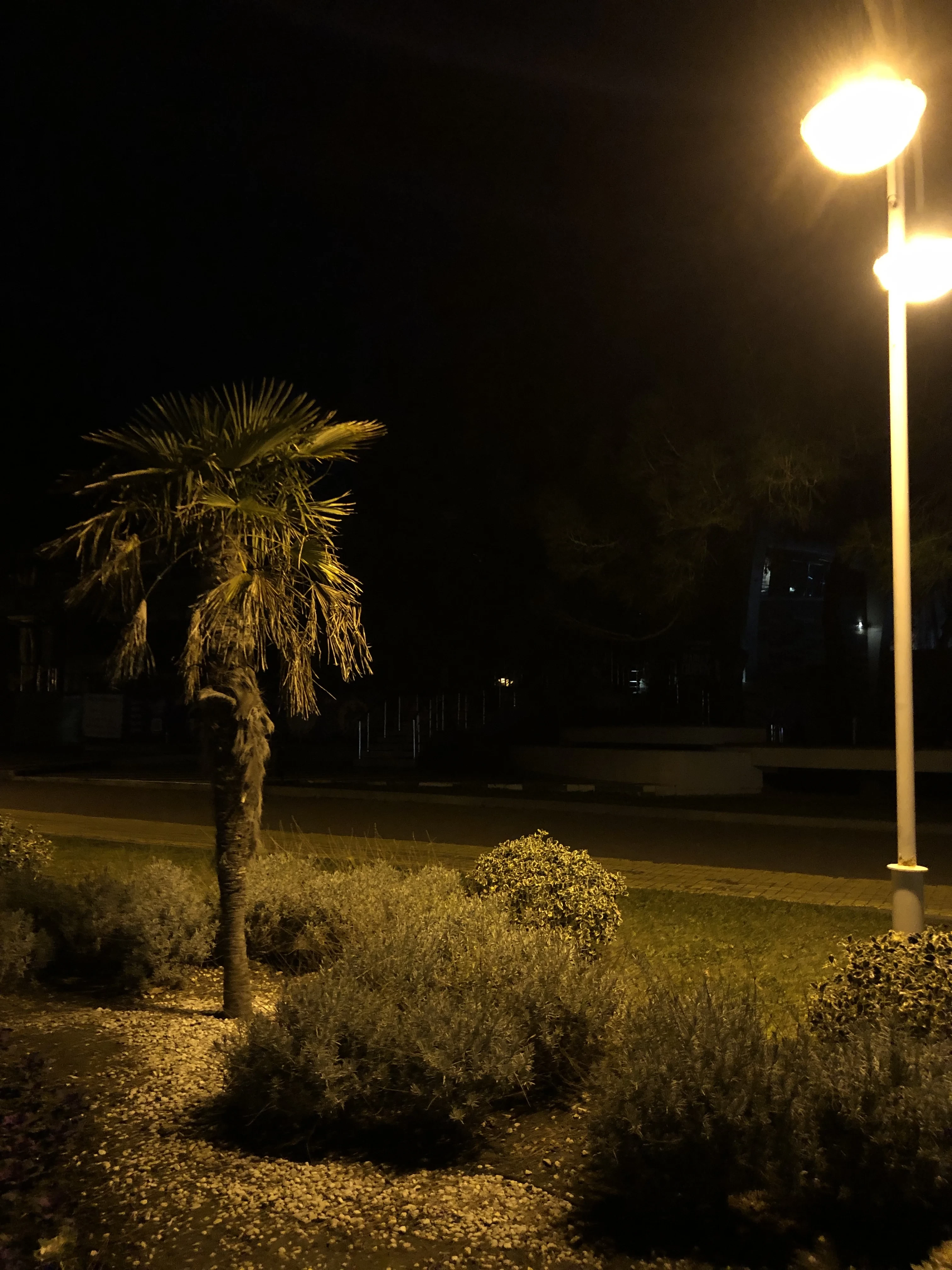 Атмосферный снимок передает таинственную эстетику южного курорта в часы ночного затишья. Контрастная игра света и тени выхватывает из глубокой темноты детализированную фактуру пальмовых ветвей и пышную зелень, создавая эффект уединенности и покоя.
