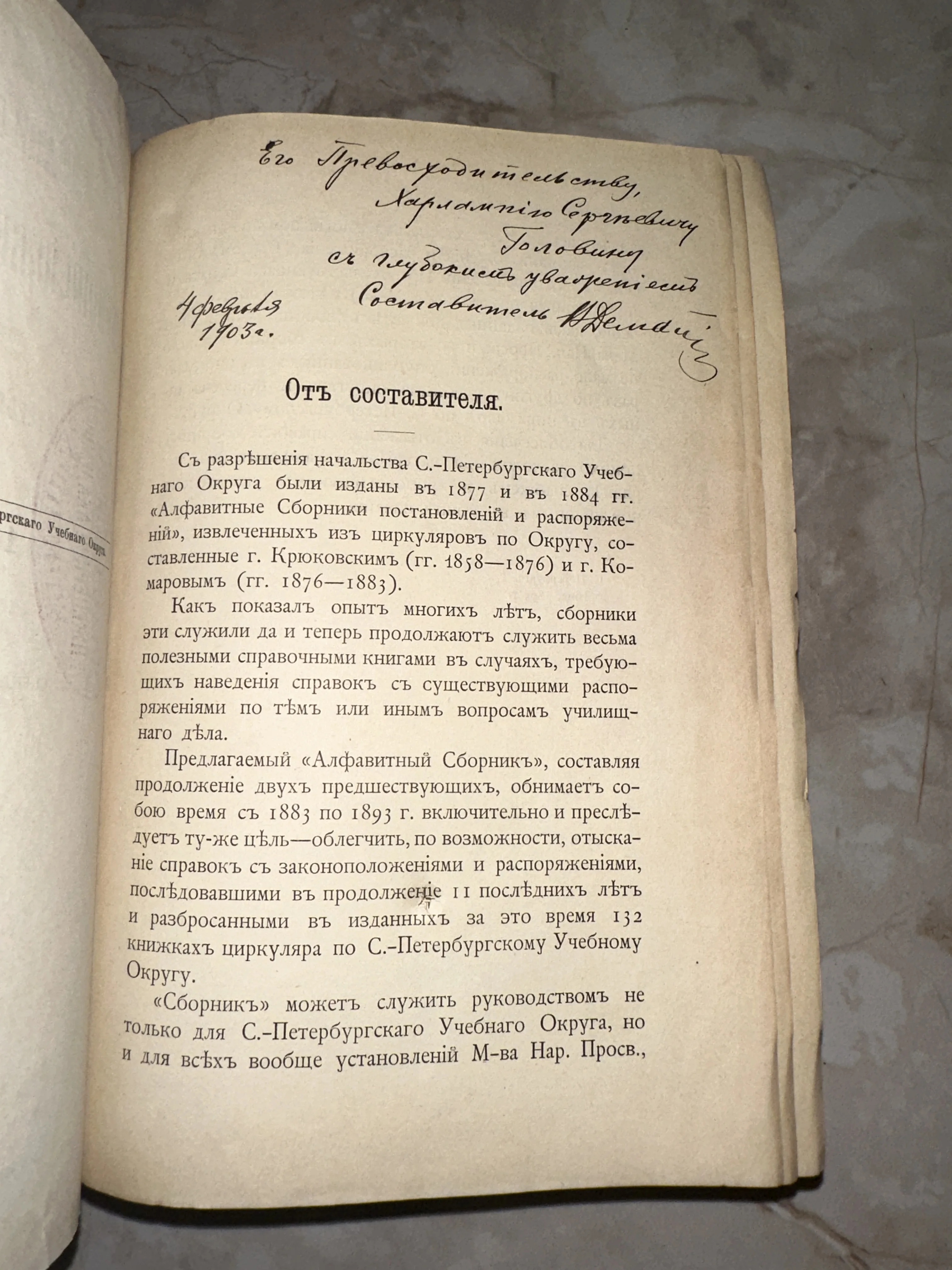 Страница старинной книги с печатным текстом 'От составителя' и рукописным посвящением чернилами на имя Харлампия Сергеевича Головина.