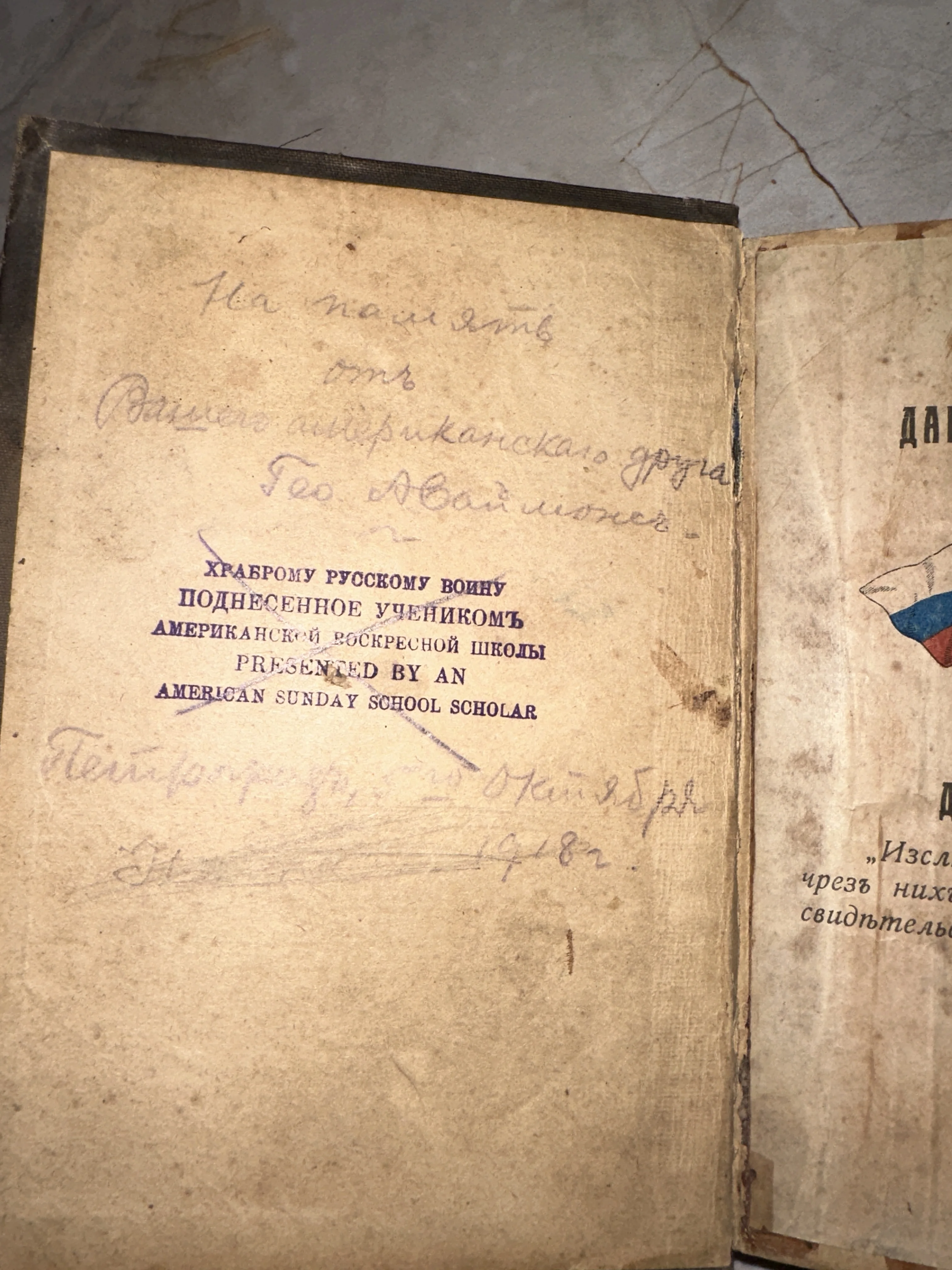 Уникальный исторический артефакт: книга, подаренная «храброму русскому воину» учеником американской воскресной школы. На пожелтевшем форзаце сохранилась трогательная рукописная надпись от американского друга, датированная октябрем 1918 года в Петрограде. Предмет обладает высокой коллекционной ценностью как живое свидетельство международных связей в переломный момент российской истории.