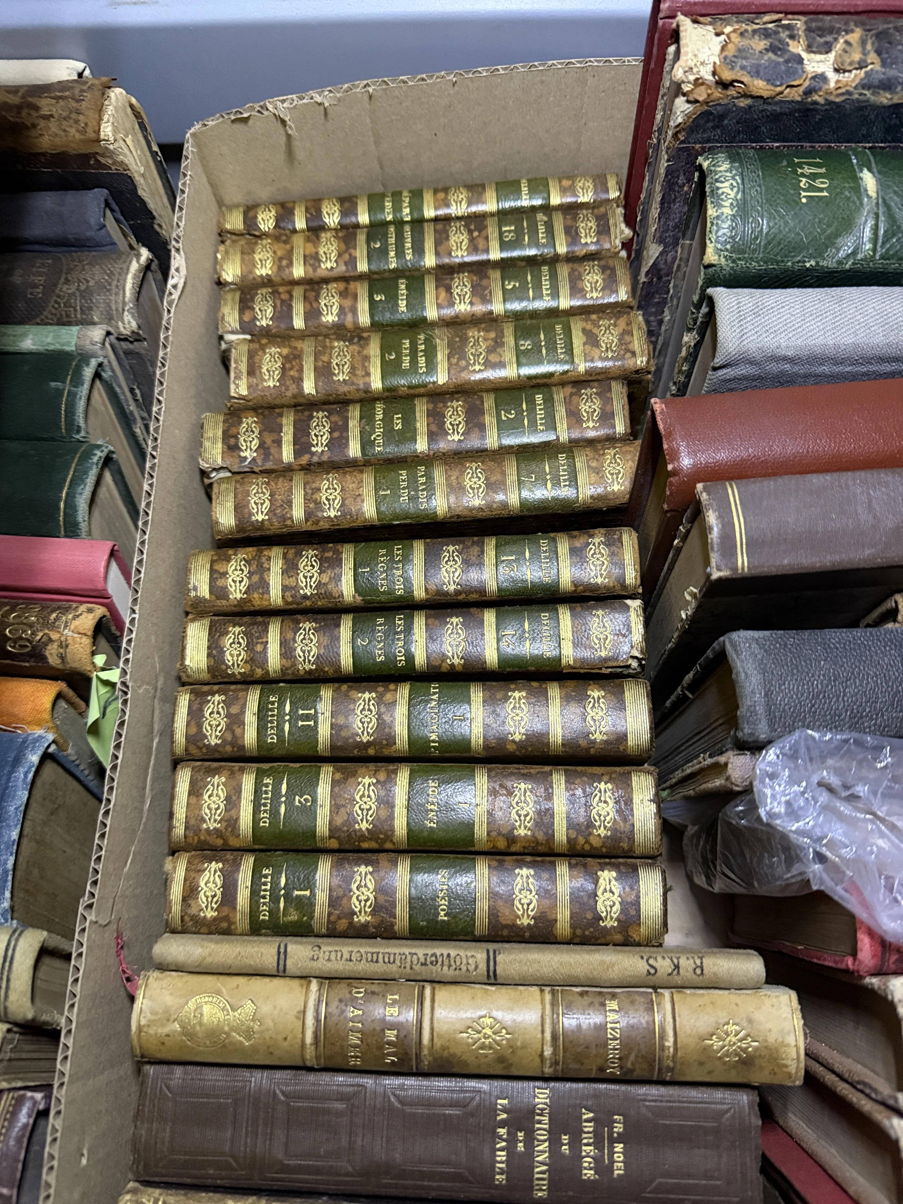 Великолепная коллекция антикварных томов с изысканным золотым тиснением на изумрудно-коричневых кожаных корешках. Издания произведений Жака Делиля и других классиков сохранили очарование старины и благородную патину времени. Эти книги станут статусным украшением домашнего кабинета или ценным пополнением библиотеки библиофила.