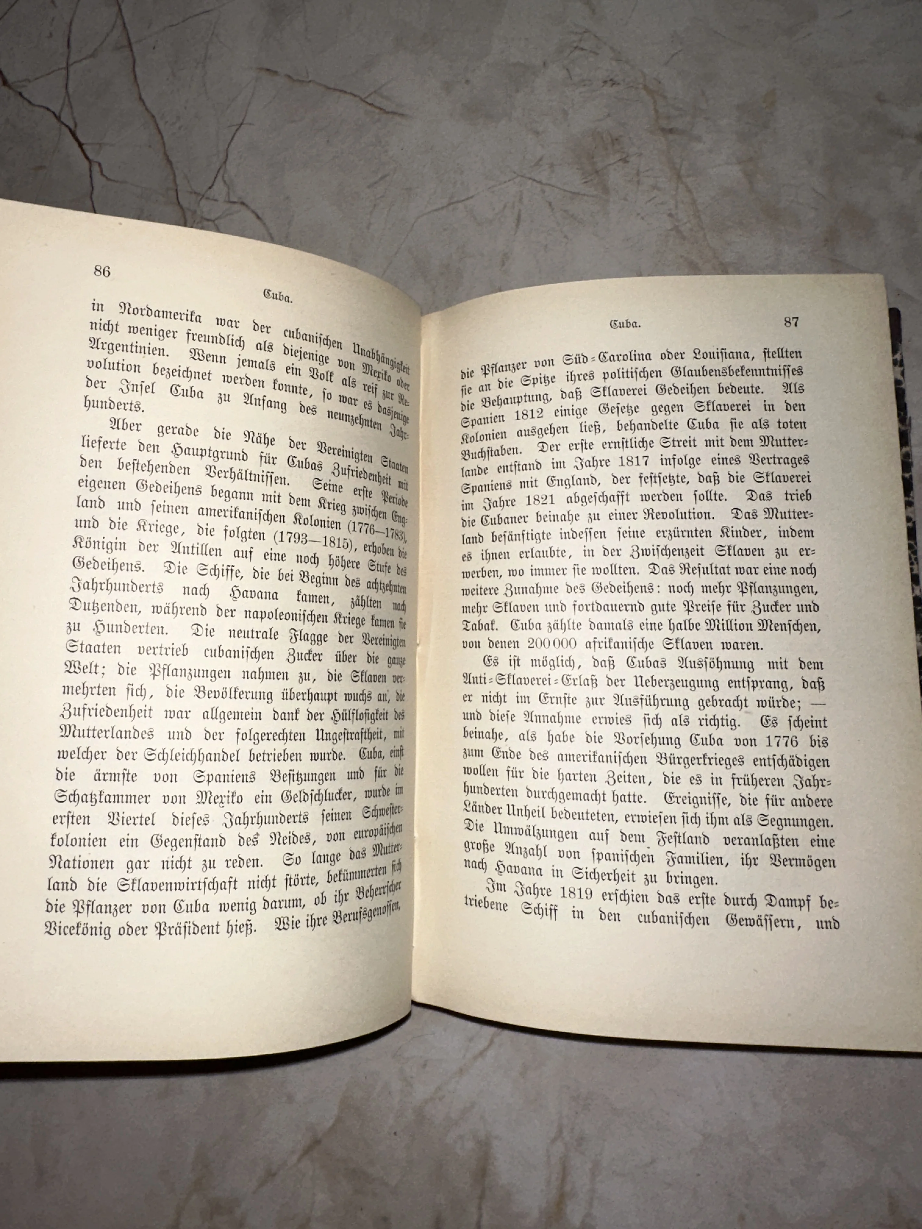 Этот редкий книжный разворот, выполненный классическим готическим шрифтом, повествует о драматической истории Кубы в XIX веке. Плотная бумага с благородной патиной времени и четкая печать подчеркивают академическую ценность этого антикварного тома. Прекрасный экземпляр для коллекционеров исторической литературы и ценителей европейской полиграфии позапрошлого столетия.