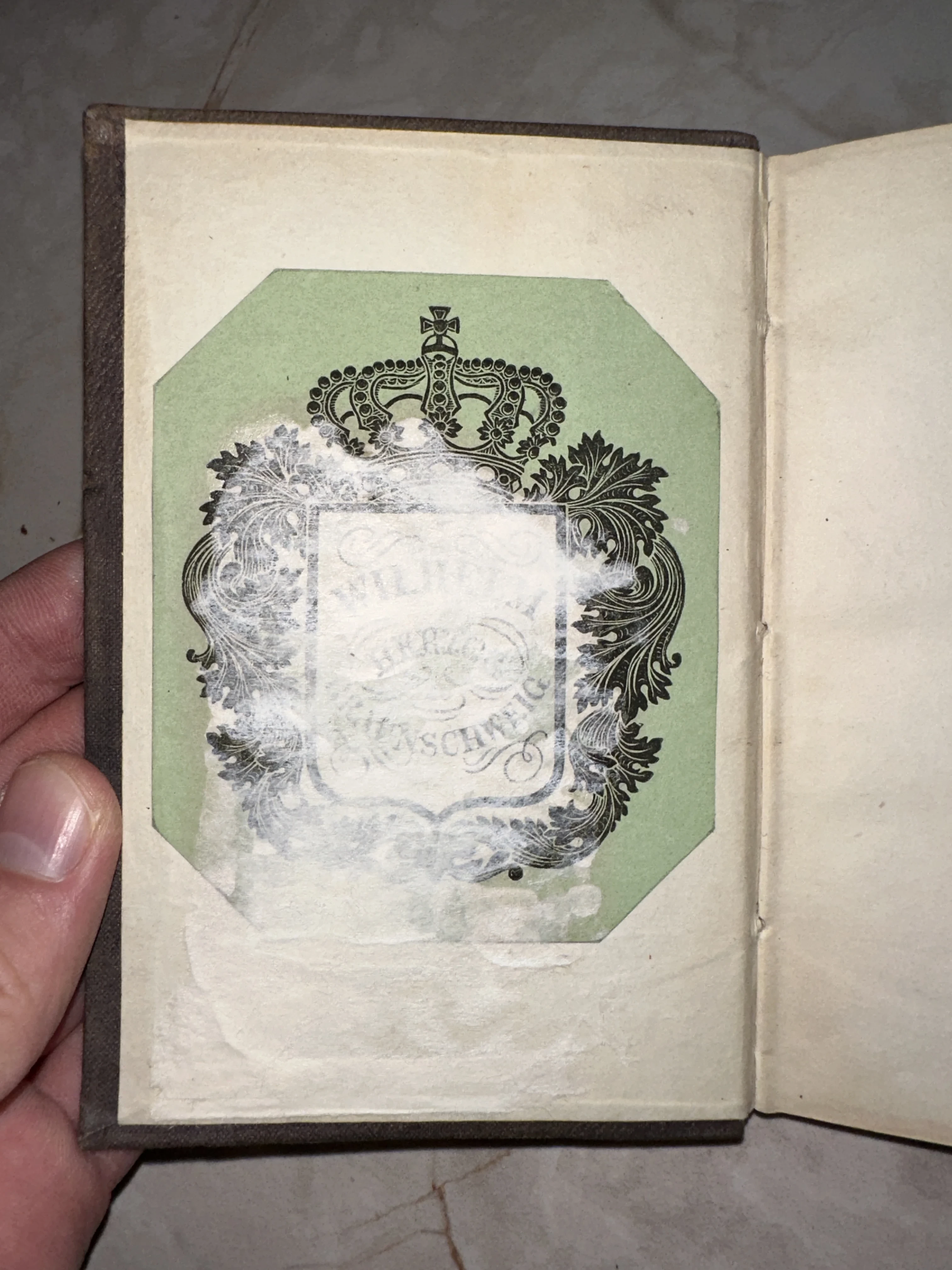Этот уникальный экслибрис принадлежит личной библиотеке Вильгельма, герцога Брауншвейгского, что придает изданию высокую коллекционную ценность. Насыщенный зеленый цвет подложки и изящная геральдическая графика с имперской короной свидетельствуют об аристократическом происхождении экземпляра. Несмотря на следы времени, предмет сохраняет дух эпохи и станет ценным приобретением для собирателей редких провинансов.