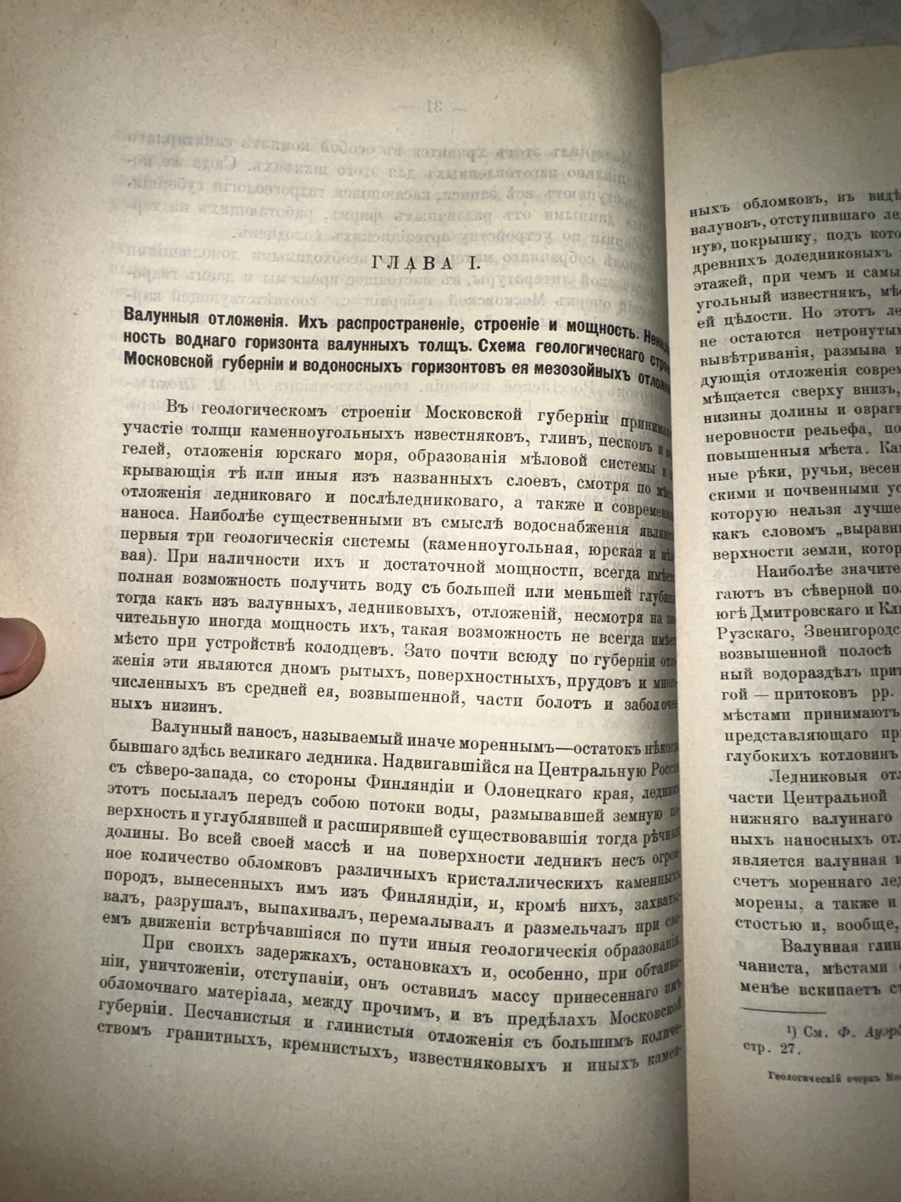 Этот редкий экземпляр дореволюционной научной мысли детально описывает геологическое строение и природные богатства Московского края. Текст набран классическим шрифтом с характерными ятями и ерами, а сама бумага приобрела благородный сливочный оттенок, свидетельствующий о ее почтенном возрасте. Настоящая находка для коллекционеров краеведческой литературы и ценителей истории отечественной науки.