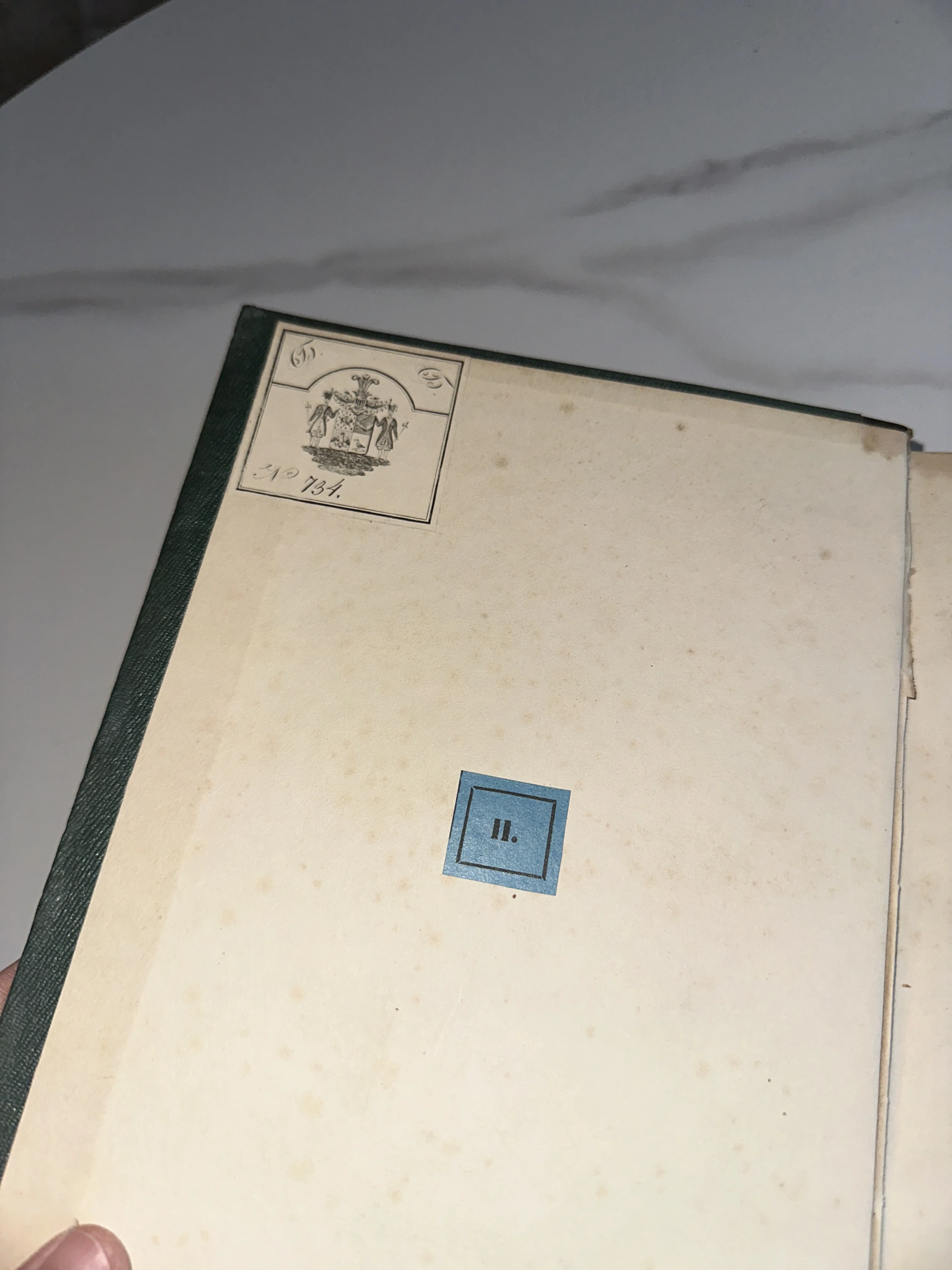 Внутренняя сторона переплета старинной книги с наклеенным экслибрисом, изображающим герб, и синей квадратной меткой с римской цифрой II.