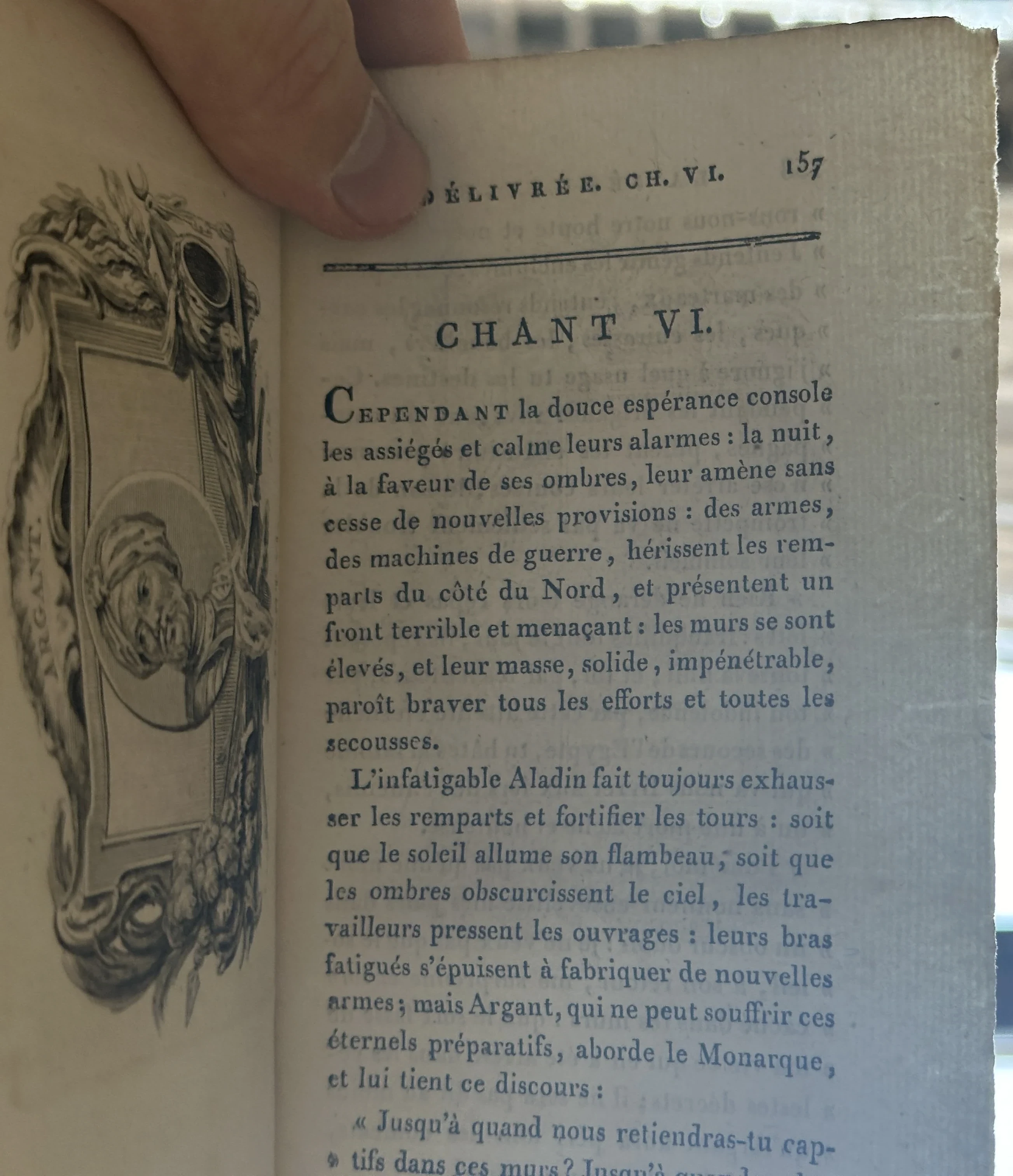 Перед вами фрагмент классической эпической поэмы, сохранивший очарование ушедших веков на своих патинированных временем страницах. Изящная гравюра-виньетка и характерная типографика эпохи классицизма делают этот экземпляр ценным приобретением для коллекционера редких фолиантов. Текст на французском языке и превосходная сохранность бумаги передают подлинную атмосферу старинной европейской библиотеки.